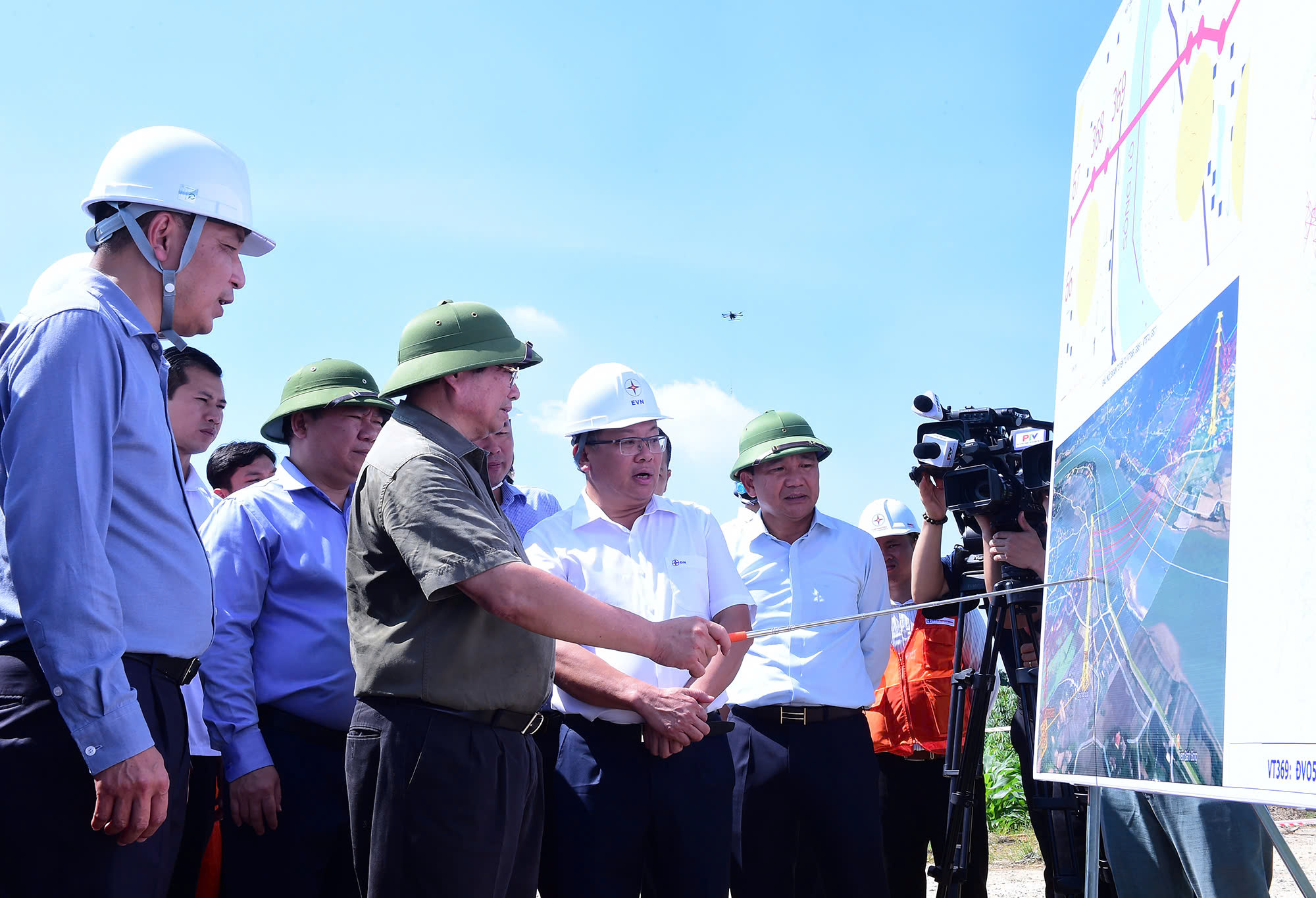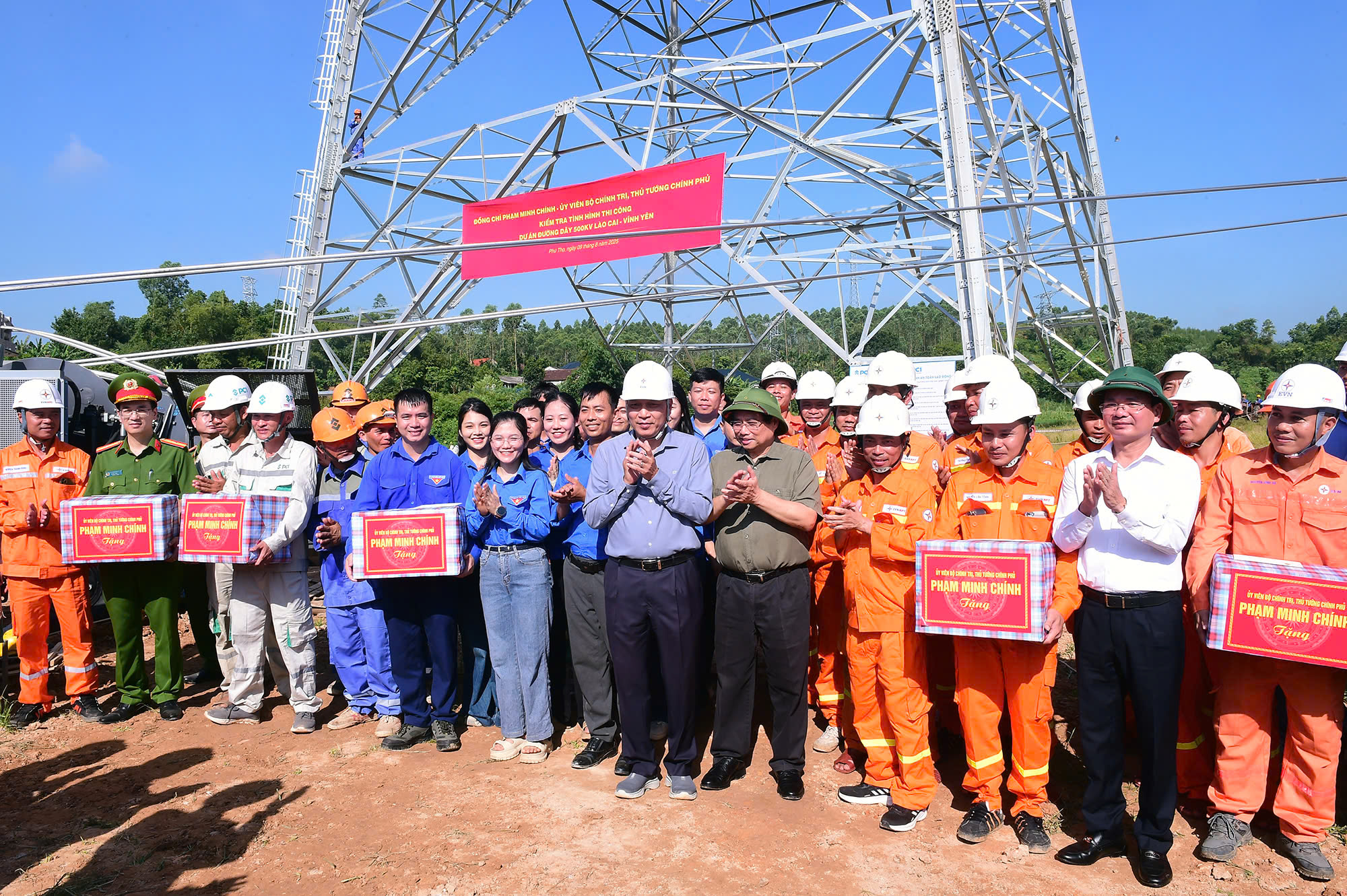 Kiểm tra tại vị trí móng cột VT404 (xã Thái Hoà) và vị trí cột móng VT369 (xã Dân Chủ) - cột điện cao nhất dự án vượt sông Lô, cao 130m, nặng 360 tấn, Thủ tướng Phạm Minh Chính đã thăm hỏi, động viên các lực lượng thi công và hỗ trợ thi công Dự án Đường dây 500kV Lào Cai - Vĩnh Yên.
