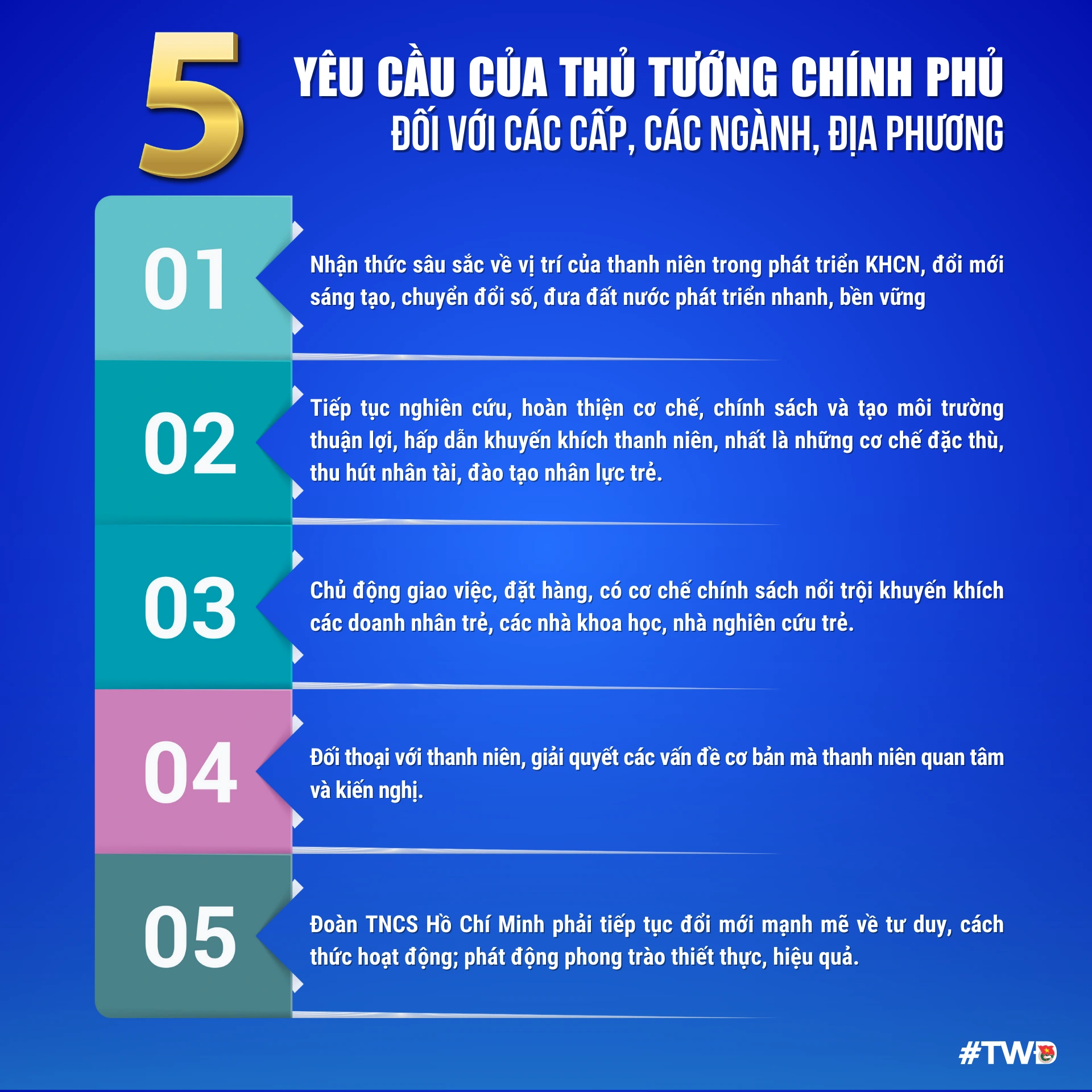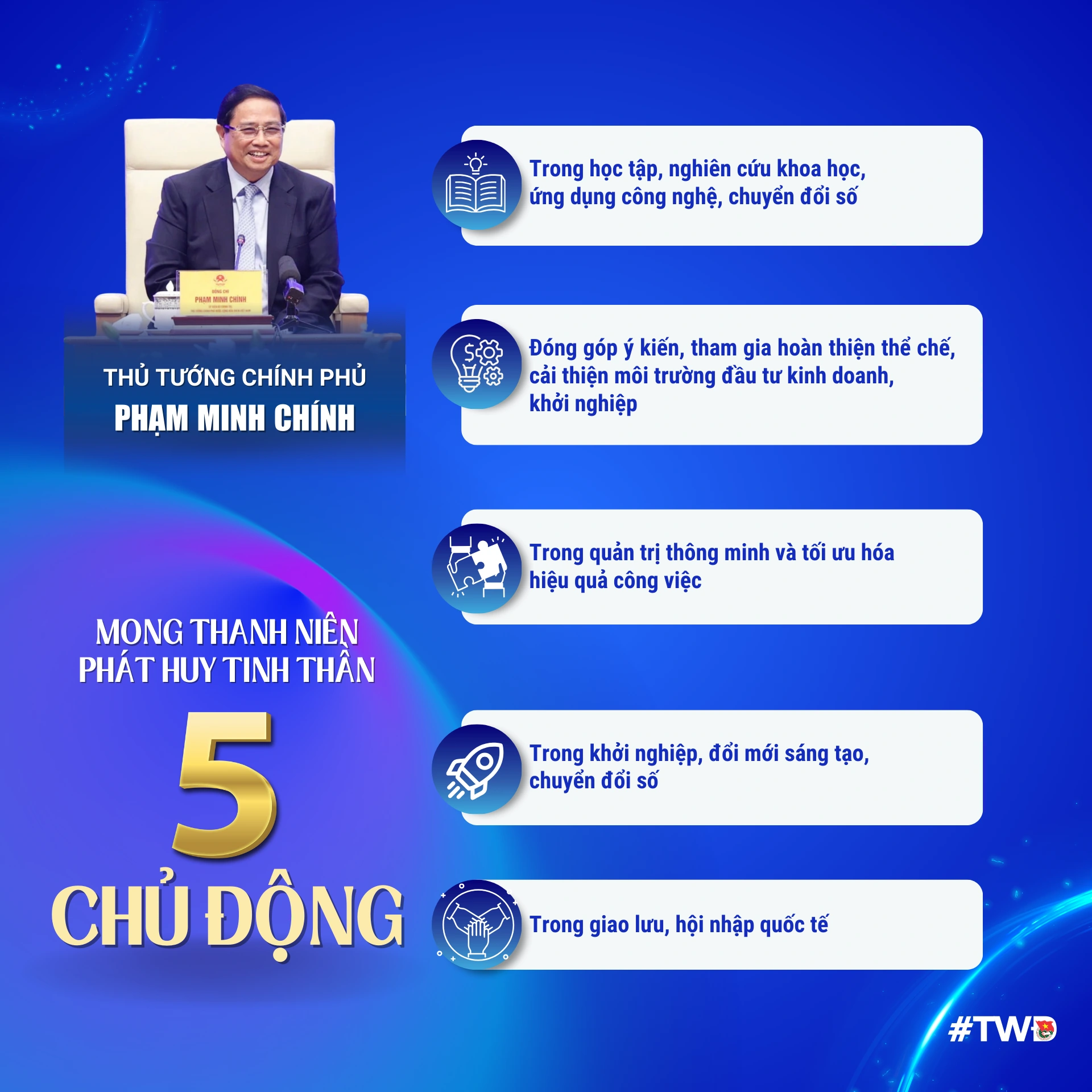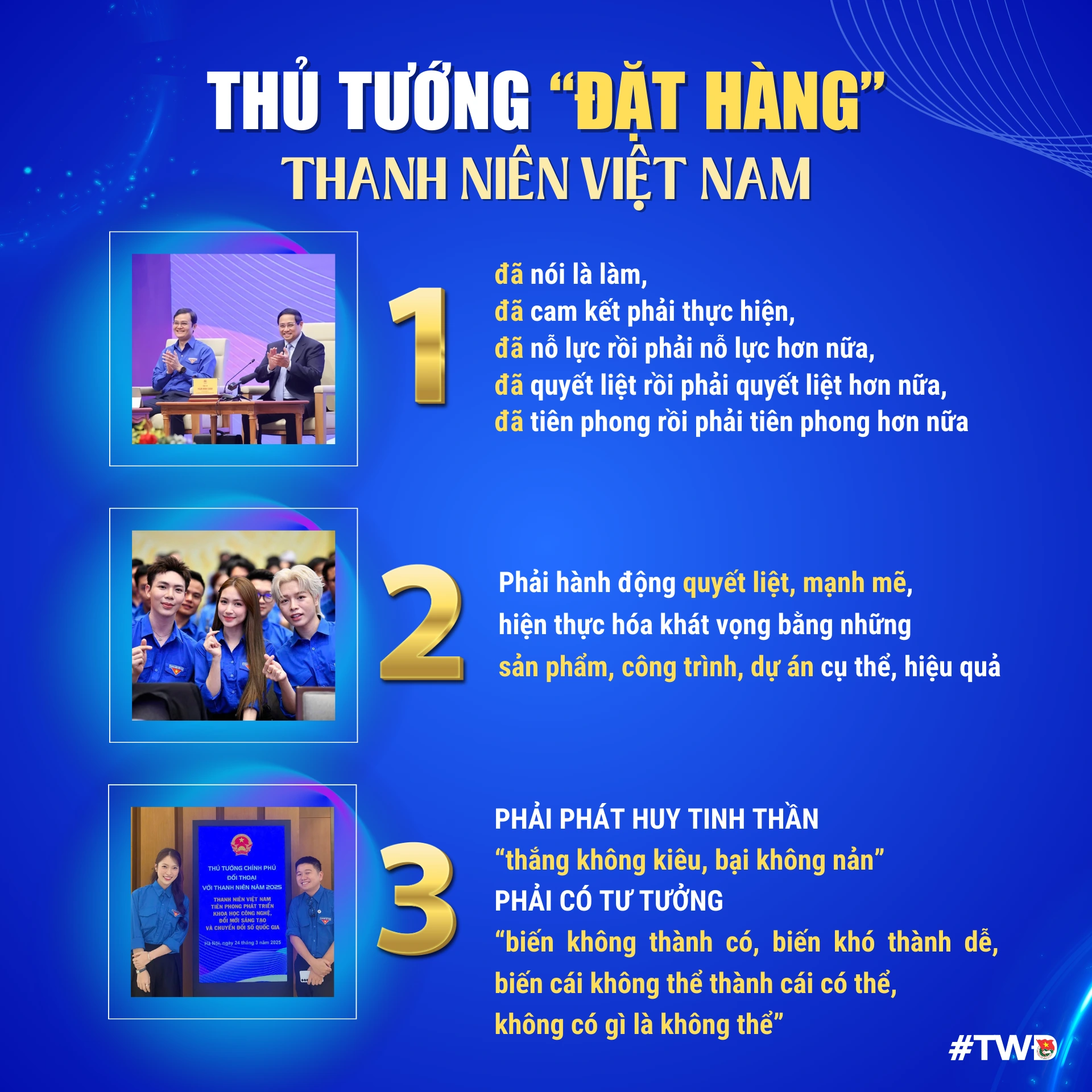 Thủ tướng nhấn mạnh: "6 dấu ấn" nổi bật của thanh niên; cam kết "3 nhiệm vụ" trọng tâm; Mong thanh niên cần phát huy tinh thần "5 chủ động"; Gửi gắm "3 đặt hàng" với thanh niên và đề ra "5 yêu cầu" với các cấp, các ngành, địa phương, là: