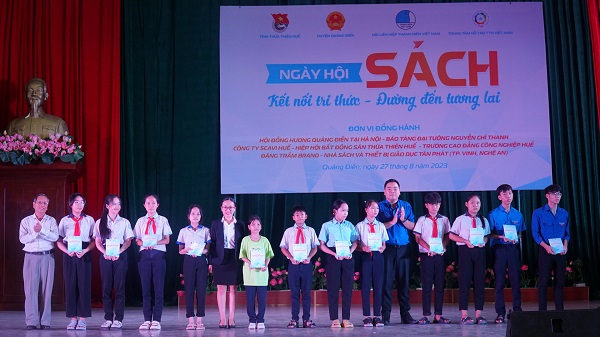 Đồng chí Nguyễn Xuân Hiếu - UVBCH Trung ương Đoàn, Phó Trưởng Ban Đoàn kết tập hợp thanh niên Trung ương Đoàn, Ủy viên Thường trực Đoàn Chủ tịch Trung ương Hội LHTN Việt Nam trao tặng học bổng cho học sinh nghèo, vượt khó học giỏi của huyện Quảng Điền
