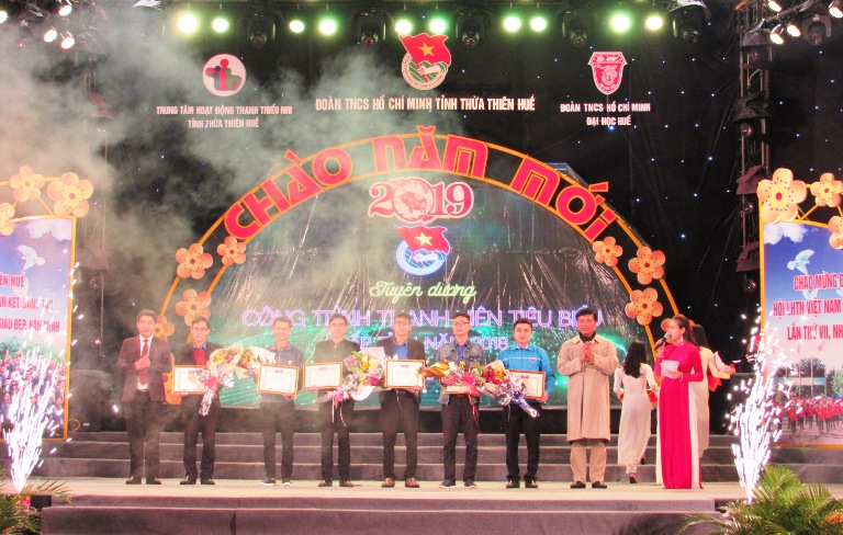 Dịp này, nhằm ghi nhận, biểu dương các tập thể có các “Công trình thanh niên tiêu biểu cấp tỉnh năm 2018”, Tỉnh Đoàn đã tặng Bằng khen và tuyên dương “7 công trình thanh niên tiêu biểu cấp tỉnh năm 2018” cho các đơn vị. Cụ thể: 1. Công trình “Ánh sáng nông thôn mới” của Huyện Đoàn A Lưới. 2. Công trình “Cánh đồng thanh niên” của Huyện Đoàn A Lưới. 3. Công trình “Khám bệnh và cấp phát thuốc miễn phí, tư vấn sức khoẻ cho các gia đình chính sách, các gia đình có hoàn cảnh khó khăn” của Đoàn Bệnh viện TW Huế. 4. Công trình “Nâng bước em đến trường” của Đoàn Bộ Chỉ huy Bộ đội Biên Phòng tỉnh. 5. Công trình “Xây dựng khu vui chơi cho thanh thiếu nhi” của Huyện Đoàn Phú Vang. 6. Công trình “Xây dựng Nhà Nhân ái” của Thành Đoàn Huế. 7. Công trình “Bê tông hoá giao thông nông thôn” của Thị Đoàn Hương Thuỷ. |