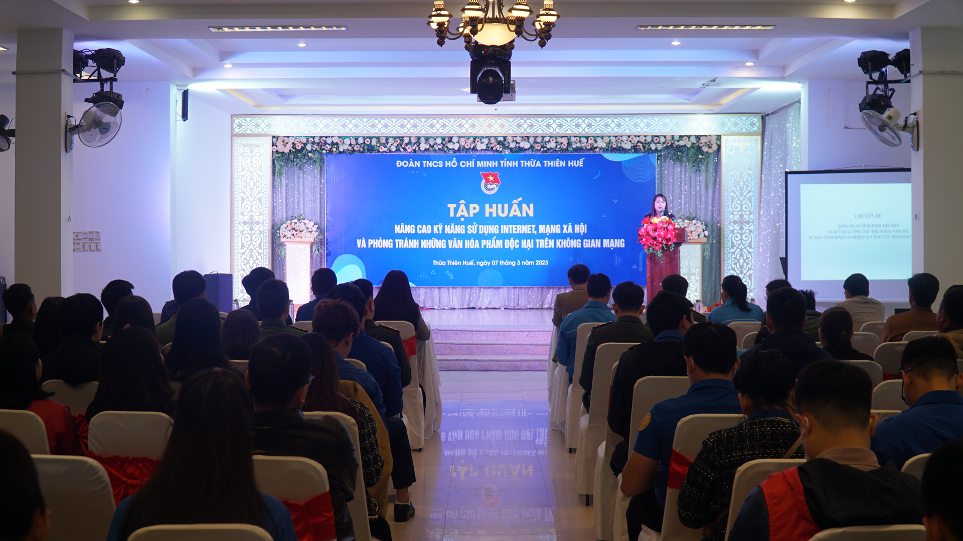 Đồng chí Nguyễn Ngọc Phương - Phó Trưởng Ban Thường trực Ban Tuyên giáo Tỉnh ủy trình bày báo cáo chuyên đề “Tình hình thời sự trong nước và quốc tế thời gian qua, định hướng một số nhiệm vụ đối với công tác bảo vệ nền tảng tư tưởng của Đảng, đấu tranh phản bác các quan điểm sai trái thù địch trong lực lượng đoàn viên, thanh niên”