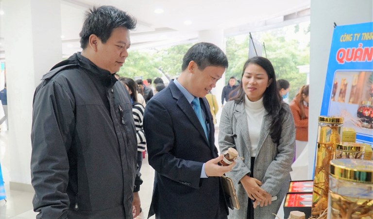 Đại biểu thăm quan gian hàng Nấm Đông trùng hạ thảo của đơn vị Thị xã Hương Trà