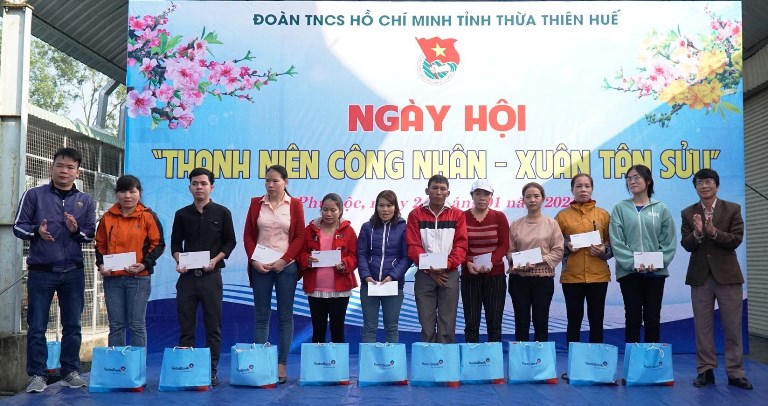 Nhằm động viên, chia sẻ với các công nhân có hoàn cảnh đặc biệt khó khăn, Ban Thường vụ Tỉnh Đoàn đã phối hợp cùng ngân hàng Vietinbank, chi nhánh Nam Thừa Thiên Huế tặng 40 suất quà cho các thanh niên công nhân có hoàn cảnh gia đình khó khăn, mỗi suất quà gồm các nhu yếu phẩm và 500.000đ.