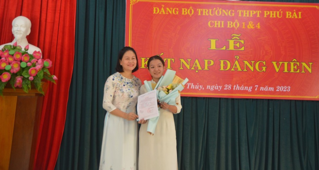 Trao quyết định kết nạp Đảng và tặng hoa chúc mừng các đảng viên mới tại trường THPT Phú Bài, thị xã Hương Thủy