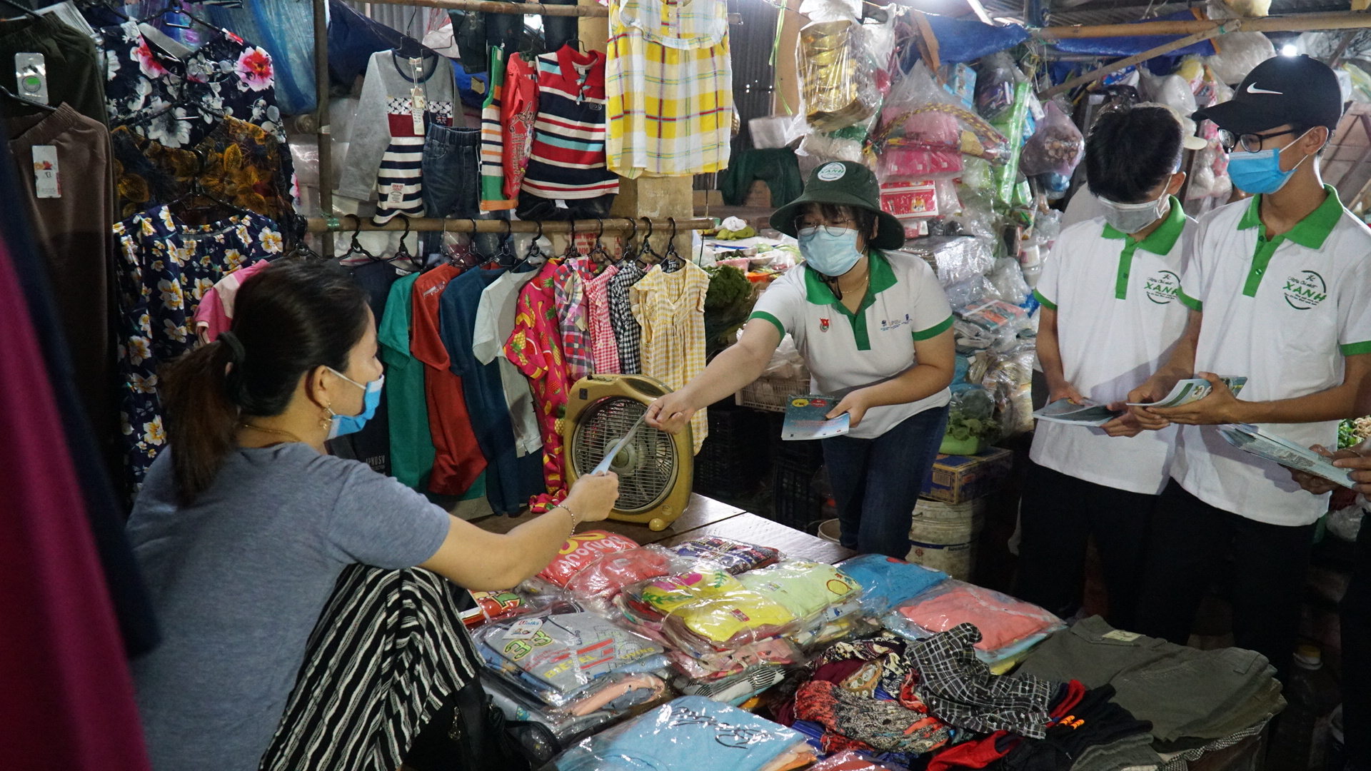 Thành viên Câu lạc bộ “Sống xanh” tham gia phát tờ rơi tuyên truyền về bảo vệ môi trường và chống rác thải nhựa tại cộng đồng dân cư và các chợ dân sinh