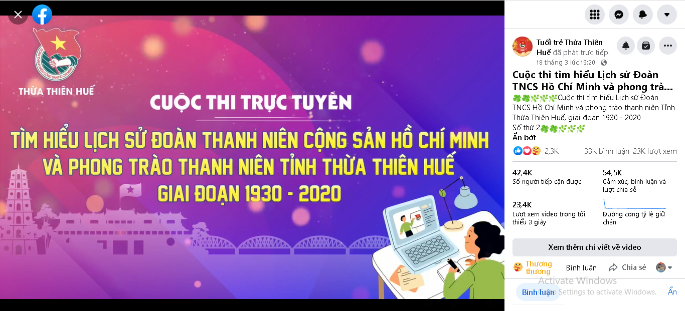 Với mong muốn tuyên truyền, giáo dục đoàn viên về quá trình ra đời, phát triển và truyền thống của Đoàn Thanh niên Cộng sản Hồ Chí Minh và phong trào thanh niên tỉnh Thừa Thiên Huế, giai đoạn 1930 – 2020; đồng thời khẳng định vị trí, vai trò của đoàn viên thanh niên toàn tỉnh qua các thời kỳ. Ban Thường vụ Tỉnh Đoàn tổ chức Cuộc thi tìm hiểu lịch sử Đoàn Thanh niên Cộng sản Hồ Chí Minh và phong trào thanh niên tỉnh Thừa Thiên Huế, giai đoạn 1930 – 2020, với hình thức tương tác trực tuyến trên mạng xã hội facebook.