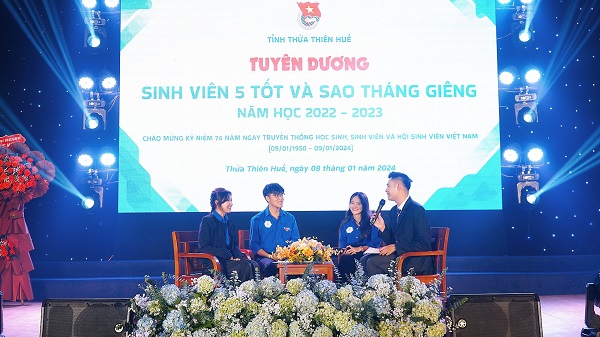 Trong khuôn khổ chương trình đã diễn ra buổi gặp gỡ và trò chuyện với 03 gương sinh viên tiêu biểu của tỉnh Thừa Thiên Huế; đó là: Sinh viên Trần Long Nhật - Phó Chủ tịch Hội Sinh viên trường Đại học Y - Dược, Đại học Huế - Là sinh viên vừa trở về từ Thủ đô Hà Nội với Giải thưởng Sao tháng Giêng; sinh viên Nguyễn Hoàng Nhật Quyên - Phó Chủ tịch Hội Sinh viên trường Đại học Khoa học, Đại học Huế - Là một trong 19 sinh viên được nhận Danh hiệu “Sinh viên 5 tốt” cấp tỉnh năm nay; sinh viên Phan Thị Ngọc Huyền - Phó Chủ tịch Hội Sinh viên trường Đại học Luật, Đại học Huế - Là một trong số những đại biểu sinh viên vinh dự được tham dự Đại hội đại biểu toàn quốc Hội Sinh viên Việt Nam lần thứ XI, nhiệm kỳ 2023 - 2028 tại Thủ Đô Hà Nội trong tháng 12 vừa qua và giờ đây, Huyền là 01 trong số những sinh viên tiêu biểu được nhận danh hiệu “Sao tháng Giêng” cấp tỉnh.