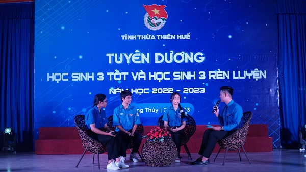 Chương trình đã lắng nghe chia sẻ của 03 gương học sinh tiêu biểu: Bạn Nguyễn Minh Triết (Học sinh trường THPT Chuyên Quốc học, thành phố Huế, người đã xuất sắc chiến thắng trận thi quý II, ghi tên vào Chung kết năm Đường lên đỉnh Olympia năm thứ 23); bạn Trương Thị Tuệ My (Học sinh trường THPT Thừa Lưu, huyện Phú Lộc, được biết, Tuệ My là một học sinh xuất sắc với điểm số rất cao, môn Toán là 9.8/10, môn Văn 9.1/10, môn Ngoại ngữ 9.9/10, tổng điểm trung bình là 9.7/10); bạn Nguyễn Ngọc Diễm Quỳnh (Học sinh trường THPT Phú Bài, thị xã Hương Thủy với những thành tích xuất sắc đạt được trong năm học 2022 - 2023).