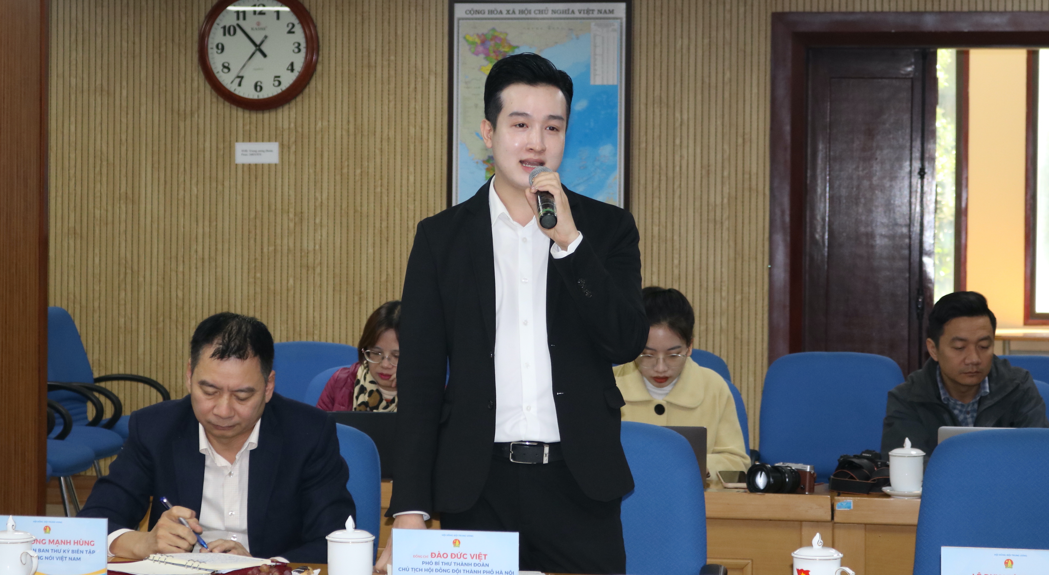 Đồng chí Đào Đức Việt, Chủ tịch Hội đồng Đội thành phố Hà Nội phát biểu ý kiến tại hội nghị