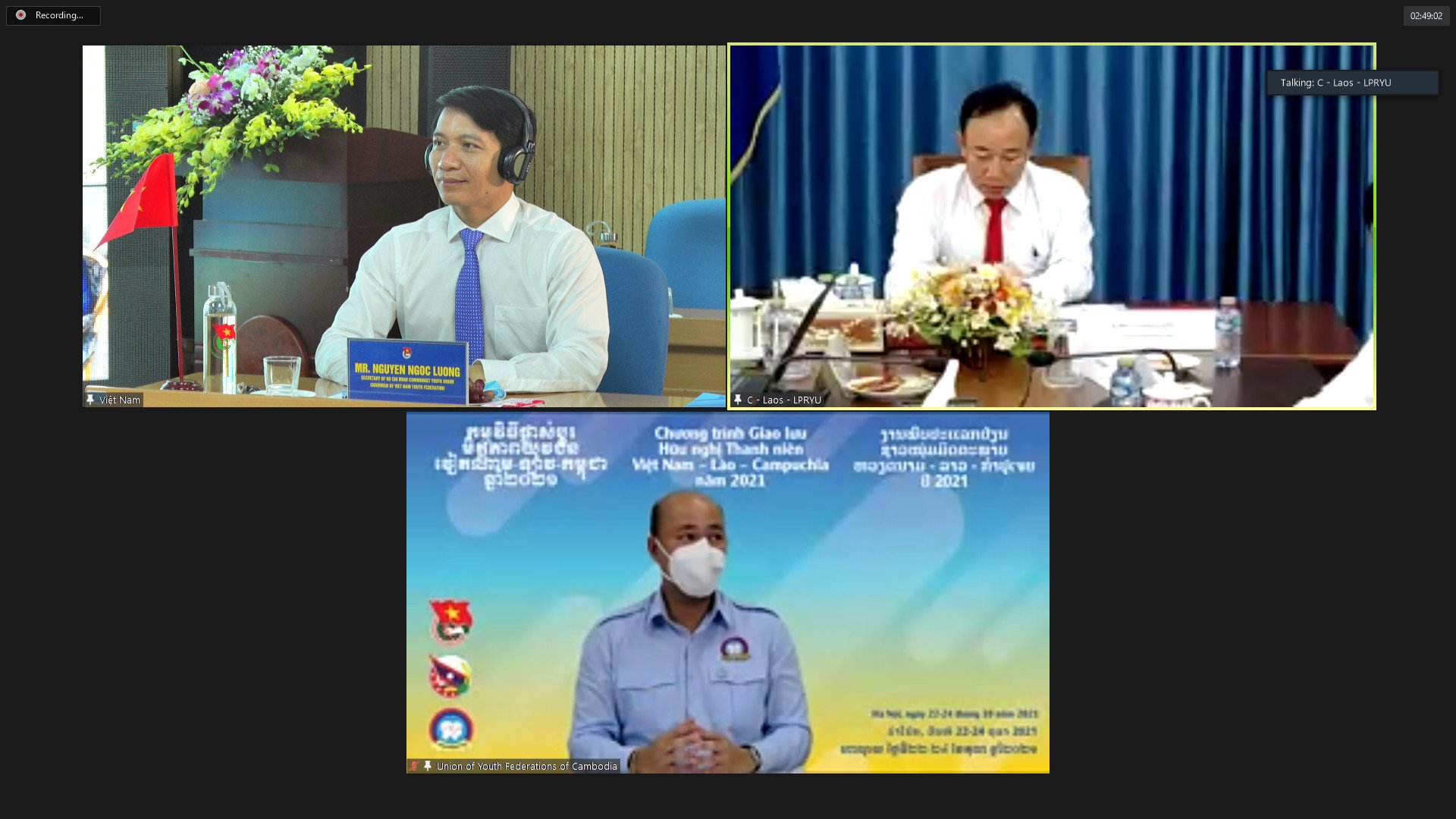Vui mừng được gặp gỡ tại chương trình giao lưu, đồng chí Thoong chăn Phu Mu Phăn, Phó Bí thư BCH Trung ương Đoàn Thanh niên Nhân dân Cách mạng Lào, Phó Chủ tịch Hội Liên hiệp Thanh niên Lào bày tỏ, trong tình hình dịch bệnh, phong trào thanh niên ba nước vẫn phát triển rộng rãi, truyền thống hữu nghị và tinh thần đoàn kết giữa 3 nước tài sản vô giá, mối quan hệ đó cần phải giữ gìn phát huy. Đồng thời, tăng cường hợp tác trao đổi kinh nghiệm giúp đỡ lẫn nhau không chỉ về mặt kinh tế xã hội, giữ gìn biên giới, mà còn tăng hợp tác đầu tư và phát triển du lịch.