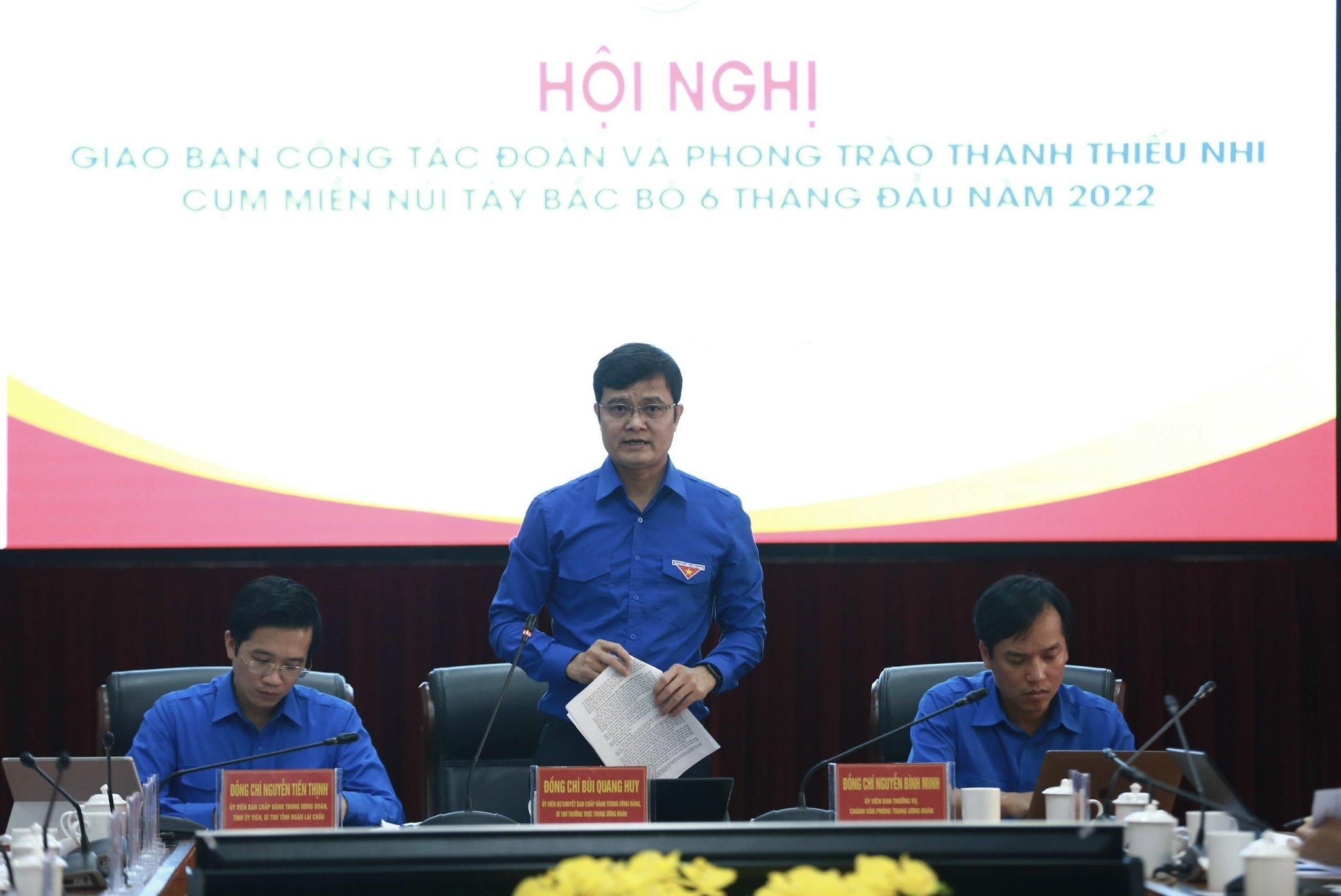 Dự Hội nghị có đồng chí Bùi Quang Huy - Ủy viên dự khuyết Trung ương Đảng, Bí thư thường trực Trung ương Đoàn; đồng chí Lê Văn Lương – Phó Bí thư thường trực Tỉnh ủy Lai Châu; đồng chí Nguyễn Bình Minh, Ủy viên BTV, Chánh Văn phòng Trung ương Đoàn; đồng chí Nguyễn Tiến Thịnh – Bí thư Tỉnh đoàn Lai Châu; đại diện lãnh đạo các ban đơn vị Trung ương Đoàn; các đồng chí thường trực tỉnh đoàn trong Cụm: Lai Châu, Lào Cai, Yên Bái, Hòa Bình, Sơn La, Điện Biên.
