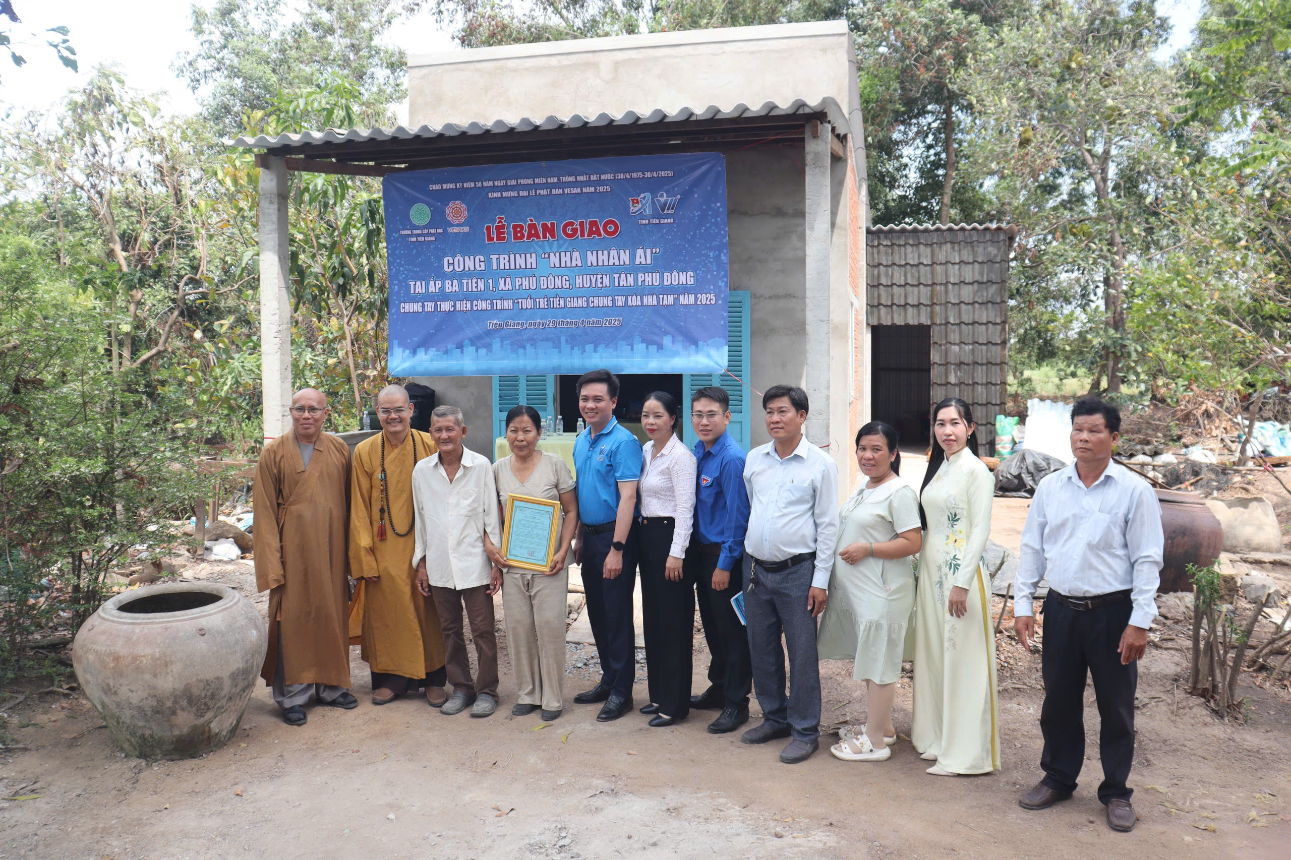 Gia đình ông Nguyễn Văn Nhà là hộ khó khăn trên địa bàn ấp Bà Tiên 1, xã Phú Đông, huyện Tân Phú Đông. Hiện ông Nhàn đã tuổi cao, không còn sức lao động. Căn nhà cũ của ông Nhàn đã xuống cấp khá nghiêm trọng: vách lá, cột gỗ xiêu vẹo, phải chằn chéo khi trời có giông gió. Qua đó, ngày 28/3/2025, Ban Thường vụ Tỉnh Đoàn, Ban Thư ký Uỷ ban Hội LHTN Việt Nam tỉnh phối hợp cùng Ban Giám hiệu Trường Trung cấp Phật học tỉnh và chính quyền địa phương, Đoàn Thanh niên huyện Tân Phú Đông, xã Phú Đông tổ chức Lễ khởi công công trình nhà. Sau gần 01 tháng xây dựng, công trình đã hoàn thành và được đưa vào sử dụng.