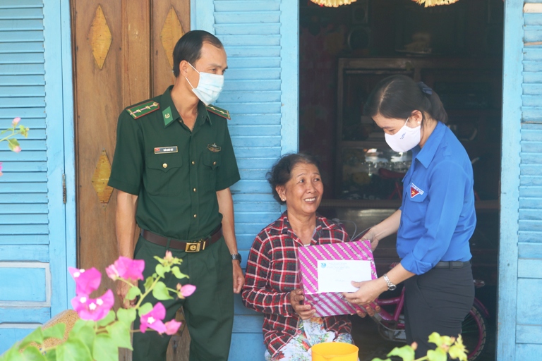 Tặng quà cho gia đình Trung úy Nguyễn Xuân Việt hiện đang công tác tại đồn Biên phòng Tân Thành.