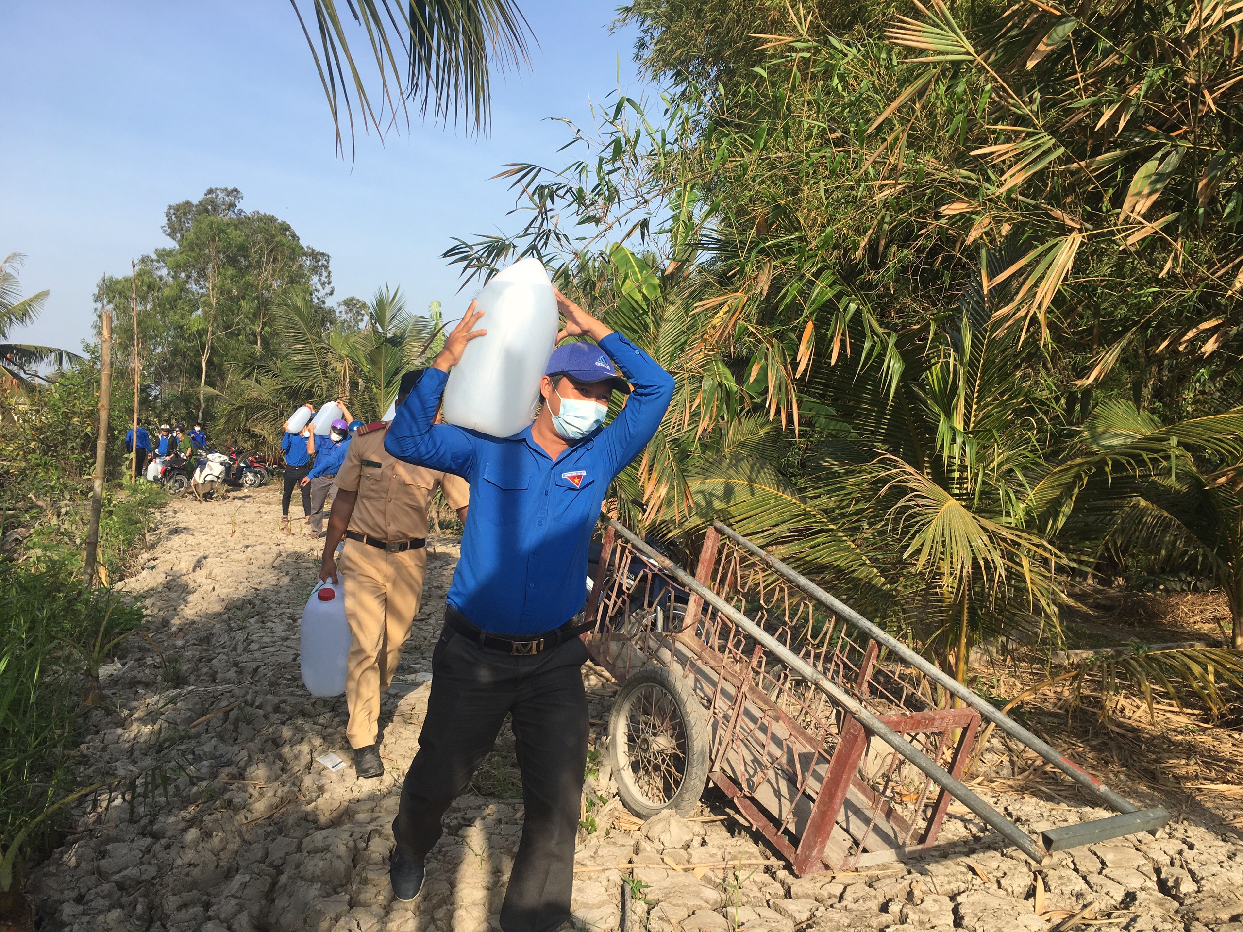 Từng thùng nước ngọt được đoàn viên, thanh niên vận chuyển đến các hộ gia đình