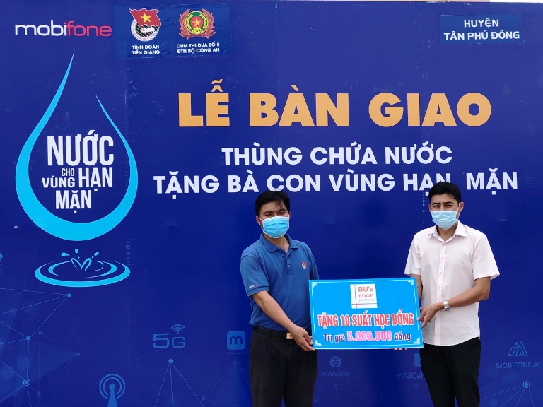 Dịp này, Tỉnh Đoàn Tiền Giang cũng phối hợp cùng Công ty cổ phần Ẩm thực Nhà Bu dành tặng 10 phần học bổng (trị giá 500.000 đồng/phần) cho học sinh nghèo vượt khó học giỏi tại huyện Tân Phú Đông, nhằm khuyến khích các em vươn lên trong học tập.