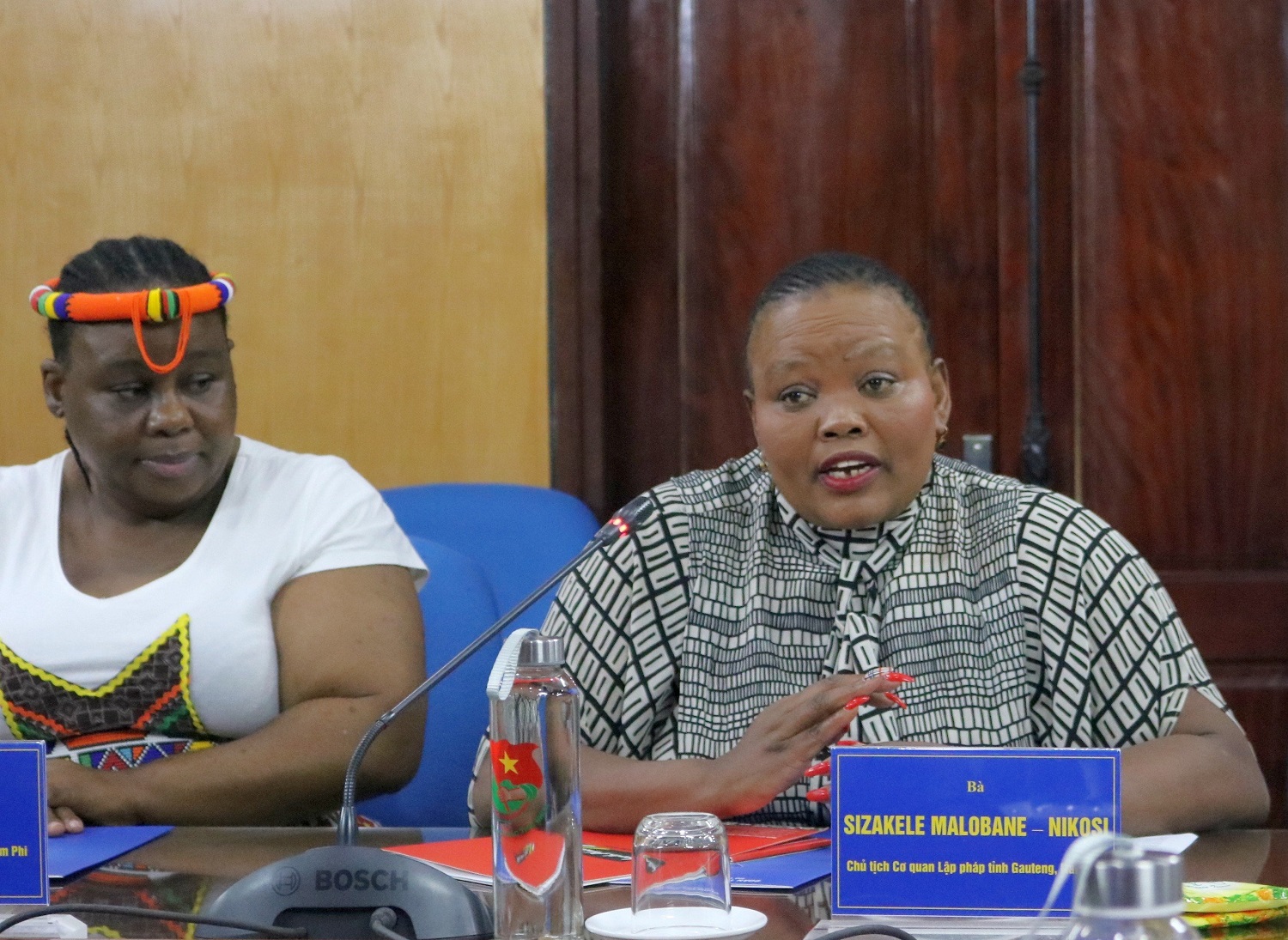 Bày tỏ sự đón tiếp trọng thị của Trung ương Đoàn TNCS Hồ Chí Minh, bà Sizakele Malobane – Nikosi, Chủ tịch Cơ quan Lập pháp tỉnh Gauteng Nam Phi cho rằng, đây là buổi làm việc quan trọng giữa hai tổ chức giúp phía Nam Phi được học hỏi thêm nhiều kinh nghiệm về các vấn đề liên quan đến thanh niên, học sinh, sinh viên như khởi nghiệp, lập nghiệp, công tác tuyên truyền, giáo dục tư tưởng cho thanh niên; vai trò của thanh niên Việt Nam trong các cơ quan lập pháp, nhất là Quốc hội…