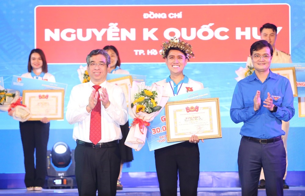 Bí thư thứ nhất T.Ư Đoàn Bùi Quang Huy (bên phải) và Phó Bí thư Thành uỷ TPHCM Nguyễn Phước Lộc trao giải Nhất cho thí sinh Nguyễn Khắc Quốc Huy (TPHCM).