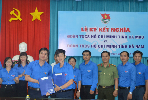 Đ/c Nguyễn Hoàng Đạo - Bí thư Tỉnh đoàn Cà Mau và đ/c Trần Ngọc Nam - Bí thư Tỉnh đoàn Hà Nam ký kết chương trình phối hợp giữa hai đơn vị
