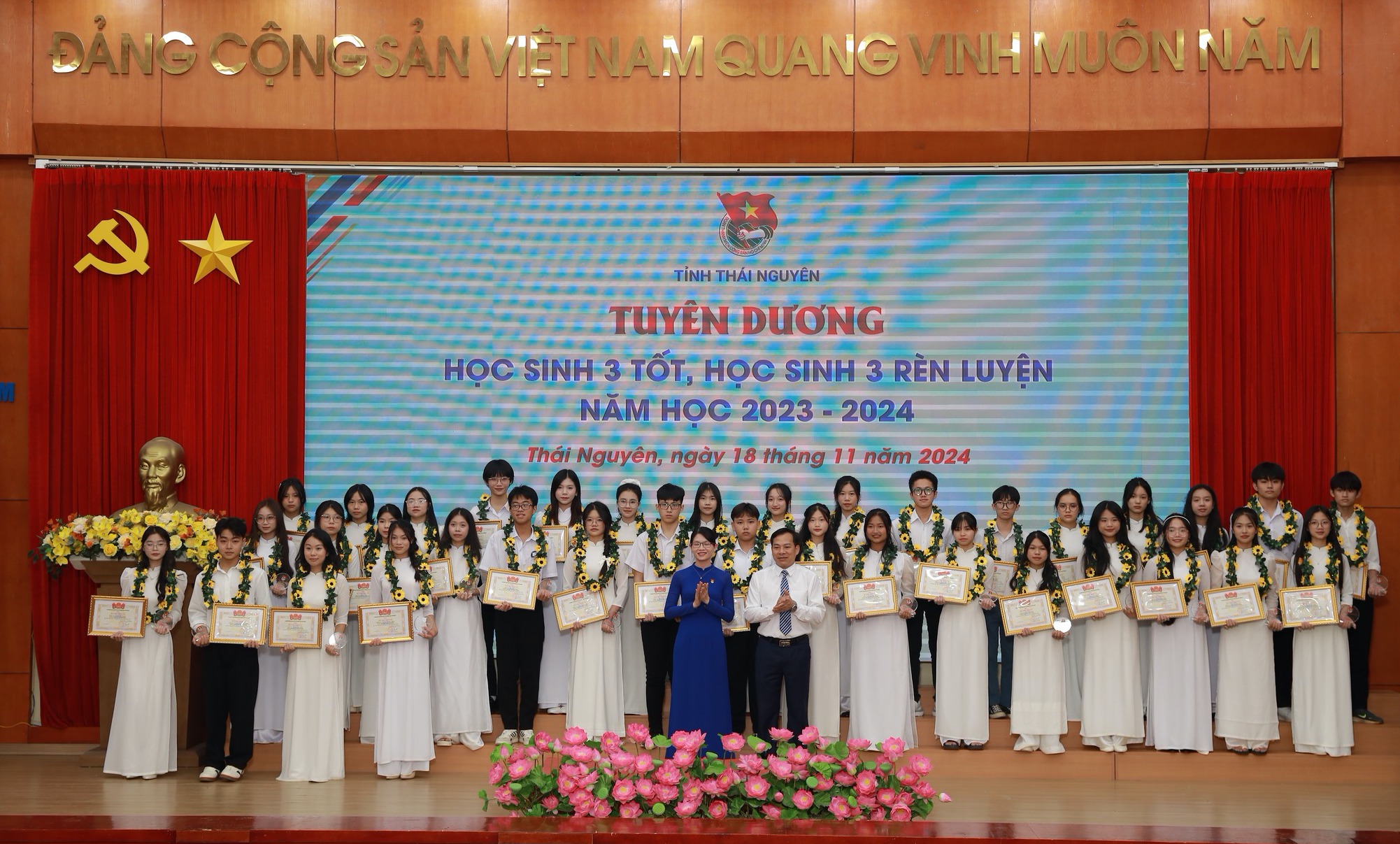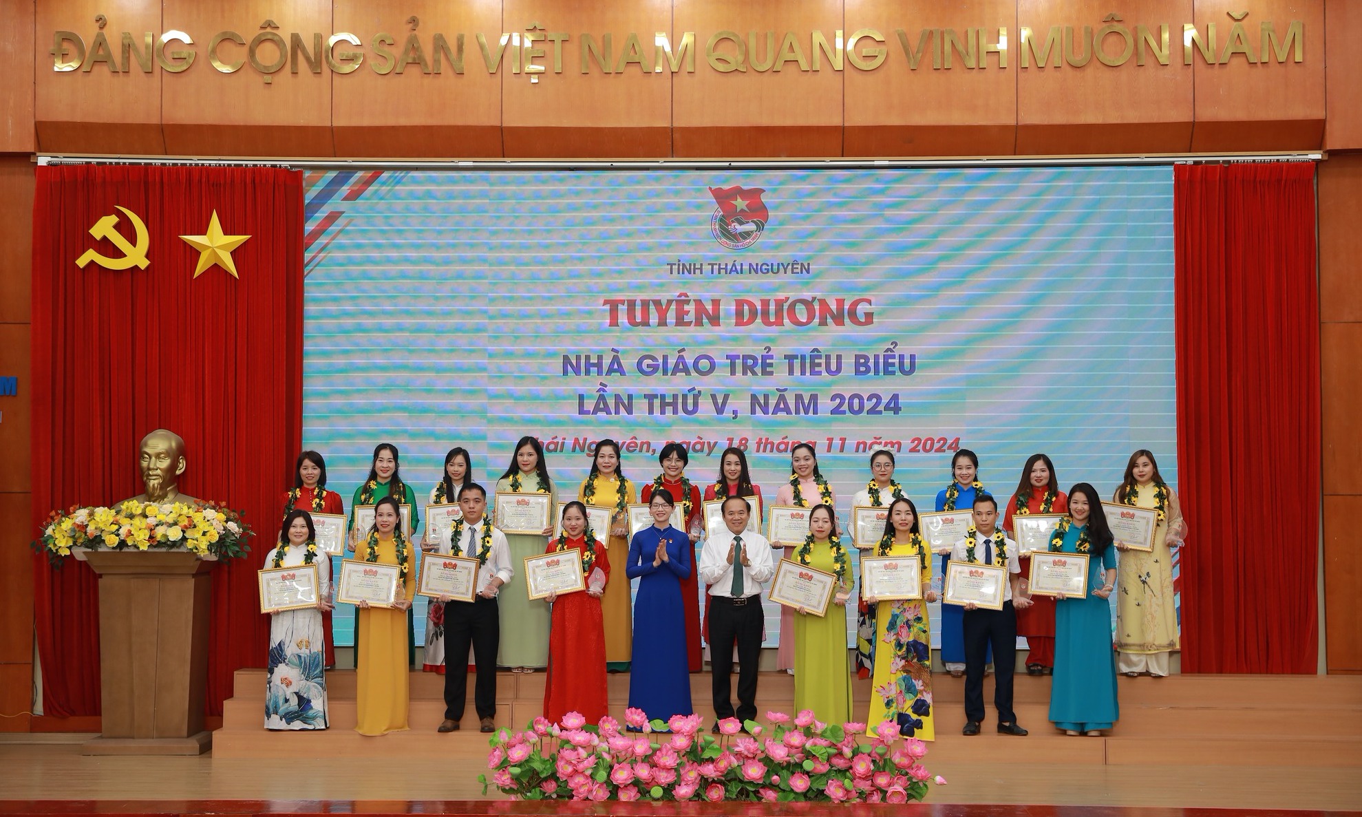 Tại chương trình, 42 thầy cô giáo đến từ các trường, cơ sở giáo dục đào tạo, cơ sở giáo dục nghề nghiệp trên địa bàn tỉnh Thái Nguyên được vinh danh Nhà giáo trẻ tiêu biểu cấp tỉnh năm 2024; vinh danh 74 gương "Học sinh 3 tốt” và "Học sinh 3 rèn luyện" năm học 2023 - 2024. Đây là những bông hoa tiêu biểu trong học tập và rèn luyện, vượt qua khó khăn, nỗ lực vươn lên, để đạt thành tích xuất sắc trong học tập, tham gia tích cực các hoạt động Đoàn và phong trào thanh niên.