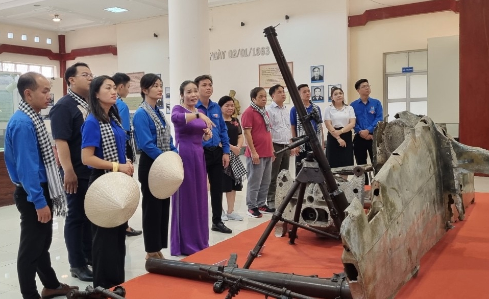 Đoàn tham quan khu di tích và nghe hướng dẫn viên giới thiệu các hiện vật lịch sử