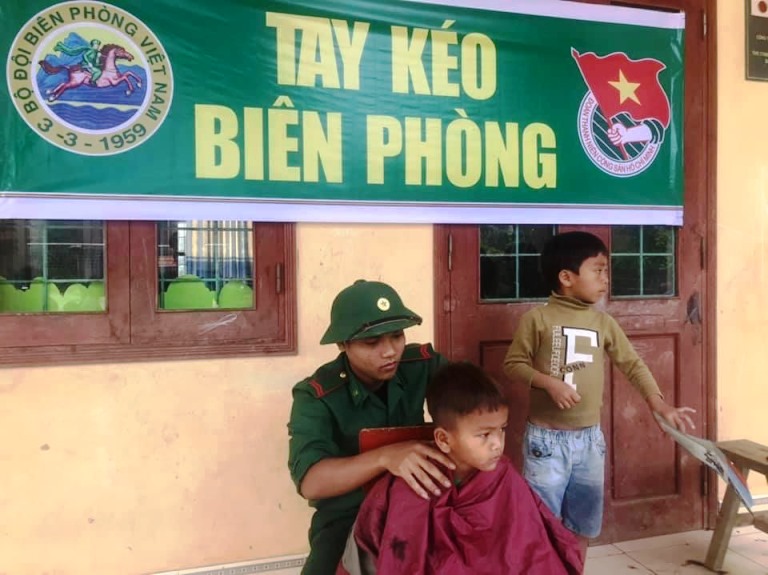 Bội đội biên phòng cắt tóc cho các em thiếu nhi