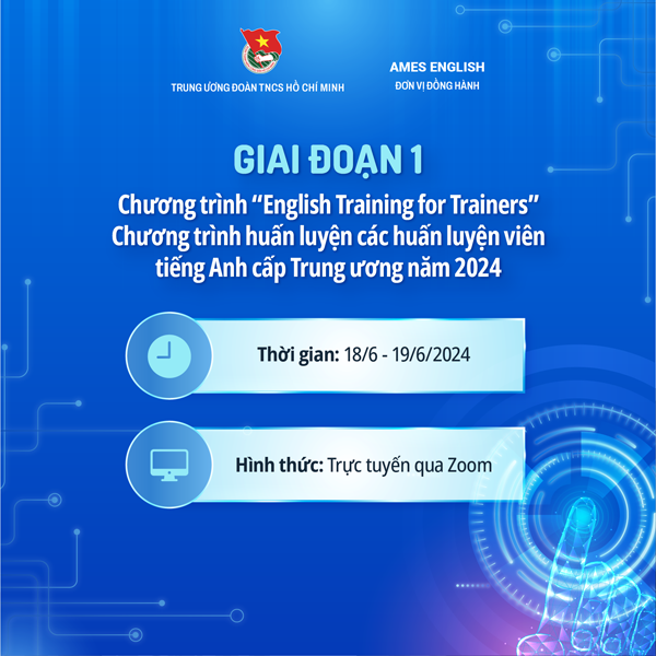 Tại Giai đoạn 1, Trung ương Đoàn TNCS Hồ Chí Minh phối hợp với Hệ thống Anh ngữ Quốc tế AMES tổ chức Chương trình Huấn luyện các huấn luyện viên tiếng Anh cấp Trung ương theo hình thức trực tuyến từ ngày 18/6 - 19/6/2024.