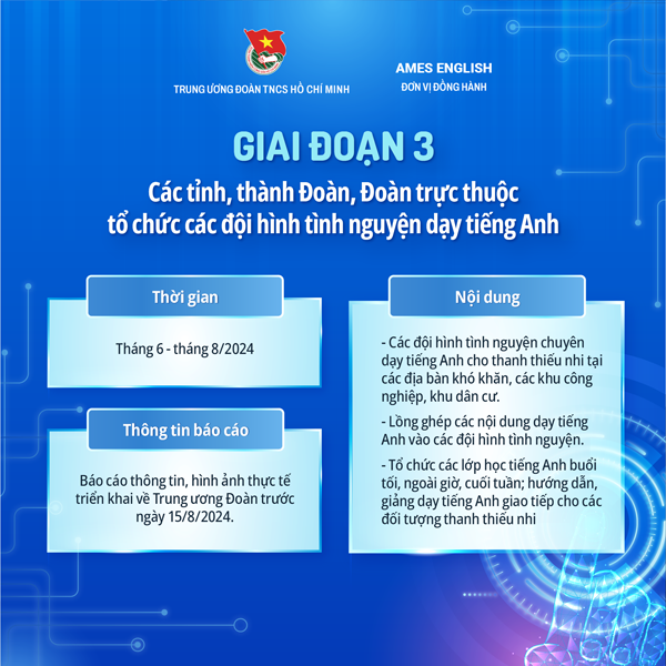 Giai đoạn 03: Các tỉnh, thành Đoàn, Đoàn trực thuộc tổ chức các đội hình tình nguyện dạy tiếng Anh gắn với Chiến dịch Thanh niên tình nguyện hè năm 2024, một số hoạt động như: (1) Tổ chức các đội hình tình nguyện chuyên dạy tiếng Anh cho thanh thiếu nhi tại các địa bàn khó khăn, các khu công nghiệp, khu dân cư; (2) Lồng ghép các nội dung dạy tiếng Anh vào các đội hình tình nguyện; (3) Tổ chức các lớp học tiếng Anh buổi tối, ngoài giờ, cuối tuần; hướng dẫn, giảng dạy tiếng Anh giao tiếp cho các đối tượng thanh thiếu nhi (thiếu nhi ở nông thôn, vùng sâu, vùng xa, các điểm khai thác du lịch, con em công nhân, người lao động; thanh niên ở các khu chế xuất, khu công nghiệp…).