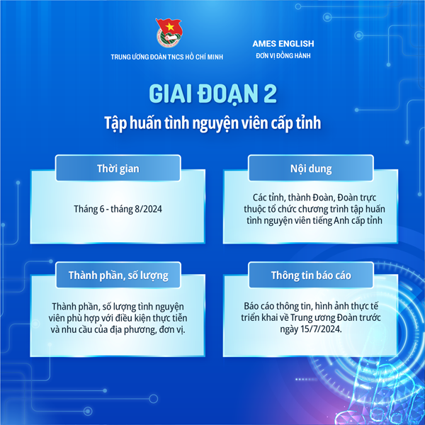 Giai đoạn 02: Tập huấn tình nguyện viên cấp tỉnh - huyện. Mỗi tỉnh, thành Đoàn, Đoàn trực thuộc tổ chức tập huấn cấp tỉnh, đề nghị mỗi Đoàn cấp huyện hoặc tương đương lựa chọn 01 đại diện trở thành huấn luyện viên tiếng Anh cấp tỉnh, sau đó phối hợp với Huấn luyện viên cấp tỉnh đã được huấn luyện ở Giai đoạn 1 (cấp Trung ương) hoặc các Trung tâm Anh ngữ ở địa phương để triển khai nội dung tập huấn tương tự với mô hình, kiến thức đã được Trung ương Đoàn huấn luyện, hướng dẫn. Thời gian triển khai trong tháng 6/2024.