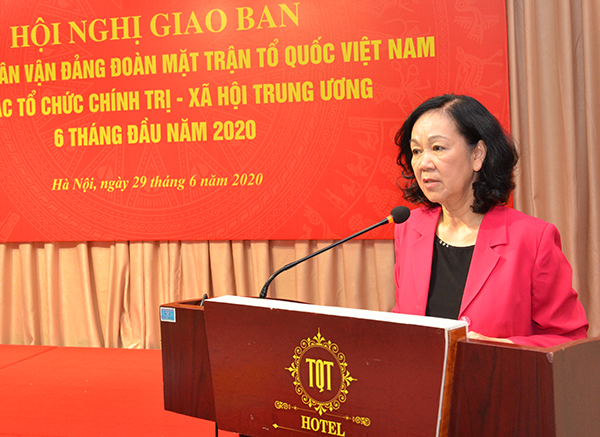 Phát biểu kết luận Hội nghị, đồng chí Trương Thị Mai, Ủy viên Bộ Chính trị, Bí thư Trung ương Đảng, Trưởng Ban Dân vận Trung ương biểu dương nỗ lực của Đảng đoàn Mặt trận Việt Nam, các tổ chức chính trị - xã hội và Ban Bí thư Trung ương Đoàn trong việc thực hiện kế hoạch, nhiệm vụ 6 tháng đầu năm. Đồng thời, Trưởng Ban Dân vận Trung ương Trương Thị Mai đánh giá cao, trước ảnh hưởng của dịch COVID-19, các tổ chức đã chủ động thích ứng, nhanh chóng chuyển đổi sang phương thức hoạt động mới; giảm họp tập trung, tăng trực tuyến, điều chỉnh kế hoạch hợp lý và duy trì các hoạt động quan trọng.
