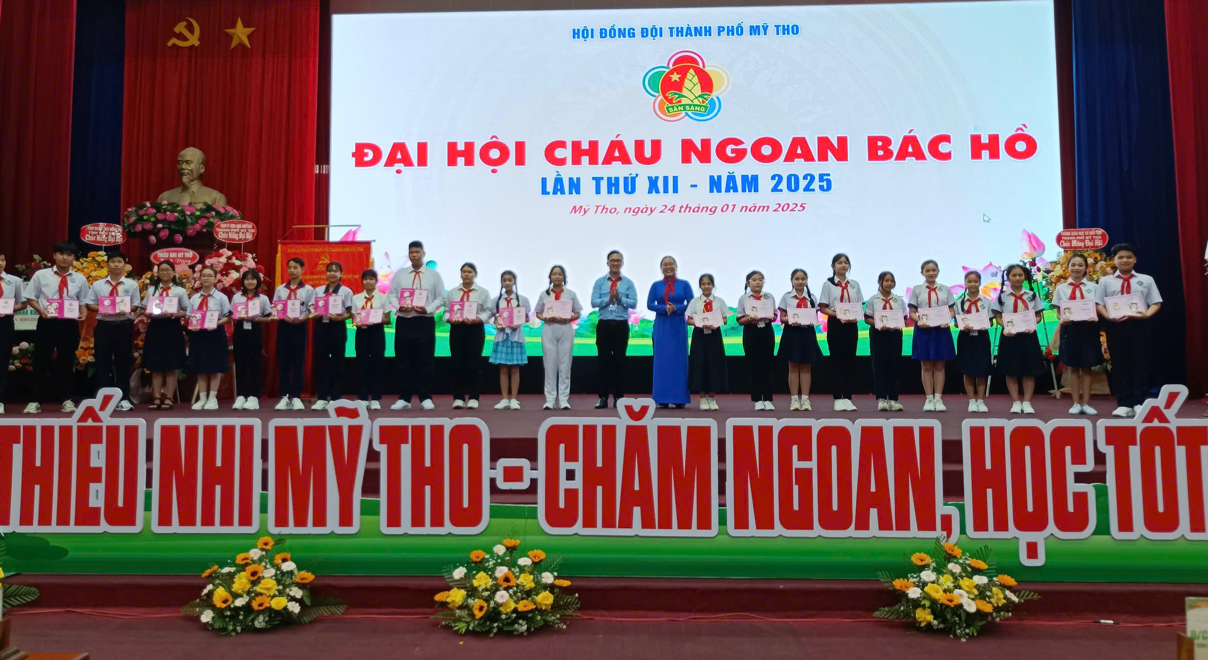 Đại hội Cháu ngoan Bác Hồ thành phố Mỹ Tho lần thứ XII, năm 2025 là đại hội cơ sở điểm cấp tỉnh, nhằm động viên, khen thưởng những đội viên, thiếu nhi xuất sắc, ngày hội giao lưu của thiếu nhi thành phố Mỹ Tho, là dịp biểu dương - tôn vinh những đại biểu đội viên thiếu niên, nhi đồng của thành phố có thành tích xuất sắc trong việc thực hiện phong trào “Thiếu nhi Việt Nam thi đua làm theo 5 điều Bác Hồ dạy”.
