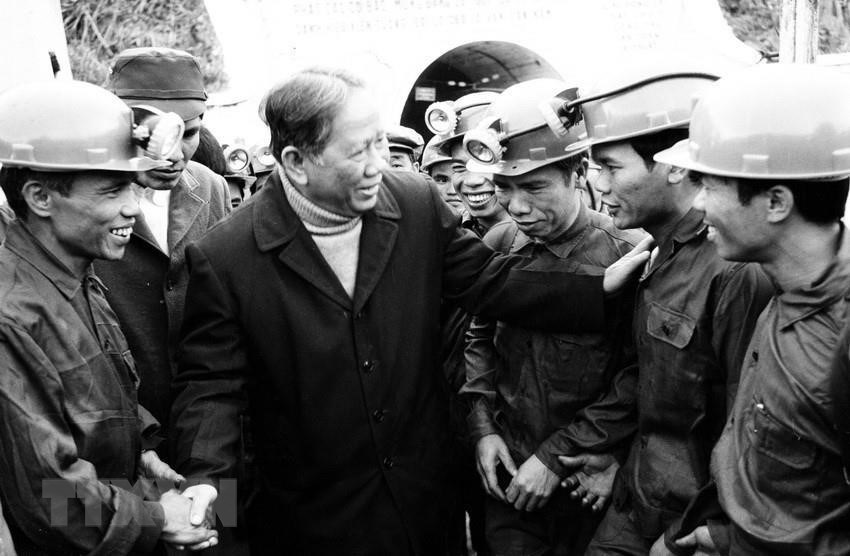 Tổng Bí thư Lê Duẩn nói chuyện với công nhân nhà máy tuyển than Cửa Ông, Quảng Ninh (1980). (Ảnh: Văn Bảo/TTXVN)