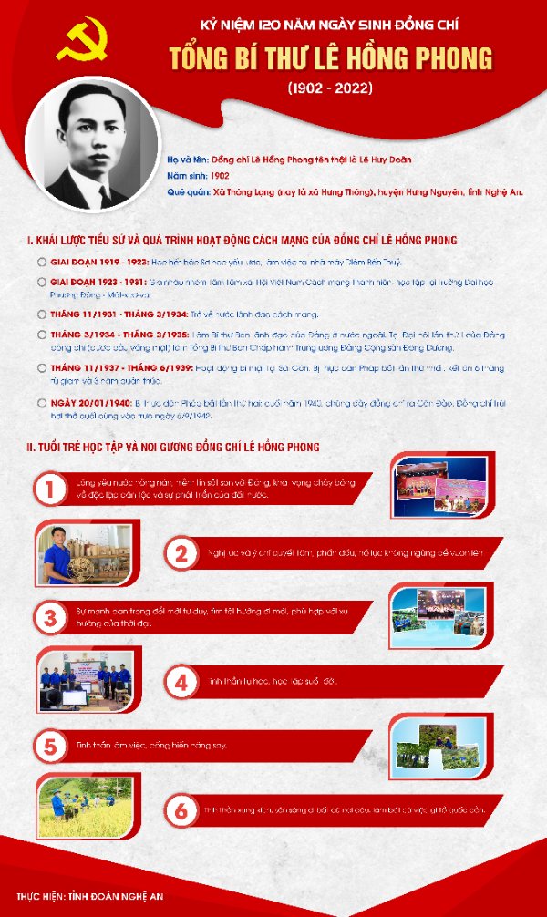 Lê Hồng Phong tên thật Lê Huy Doãn, sinh ngày 6/9/1902 tại làng Đông Thôn, tổng Thông Lạng, nay là xã Hưng Thông, huyện Hưng Nguyên (Nghệ An). Ông là nguyên Ủy viên Ban chấp hành Quốc tế Cộng sản, nguyên Tổng Bí thư Đảng Cộng Sản Đông Dương, chiến sỹ cộng sản kiên cường, người học trò xuất sắc của Chủ tịch Hồ Chí Minh, cán bộ tiền bối tiêu biểu của Đảng, đã có nhiều đóng góp to lớn trong sự nghiệp giải phóng dân tộc.