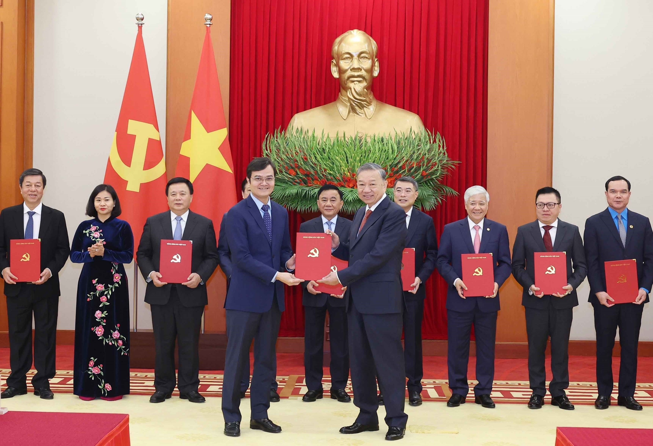 Tổng Bí thư Tô Lâm trao quyết định của Bộ Chính trị cho đại diện lãnh đạo 13 cơ quan, đơn vị. Ảnh: TTXVN