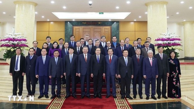 Tổng Bí thư Tô Lâm, Chủ tịch nước Lương Cường, Chủ tịch Quốc hội Trần Thanh Mẫn và các đại biểu chụp ảnh chung. Ảnh: TTXVN