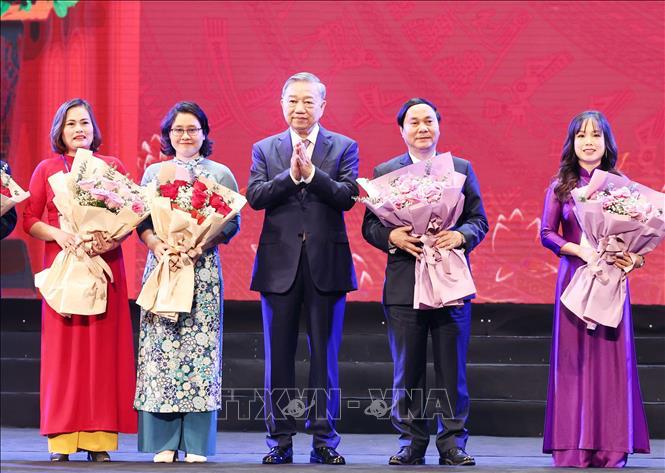 Tổng Bí thư Tô Lâm và đại biểu cùng đại diện các nhà giáo, cán bộ quản lý giáo dục tham dự buổi gặp mặt. Ảnh: Thống Nhất/TTXVN