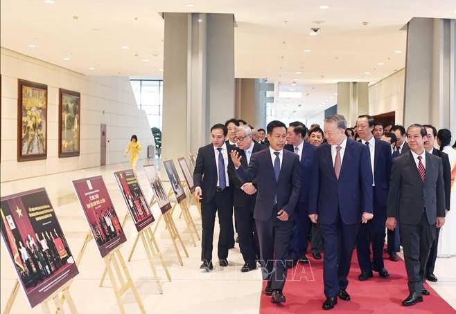 Tổng Bí thư Tô Lâm và các đại biểu tham quan trưng bày ảnh kỷ niệm ngày Nhà giáo Việt Nam. Ảnh: Thống Nhất/TTXVN