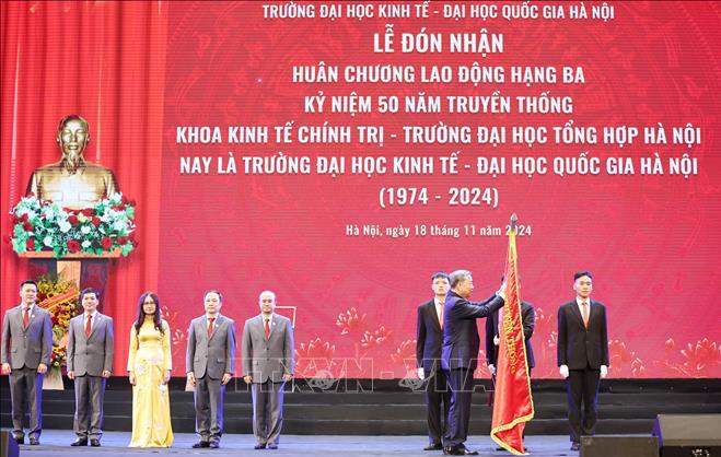 Nhân dịp này, Tổng Bí thư Tô Lâm đã trao Huân chương Lao động Hạng Ba cho Trường Đại học Kinh tế (Đại học Quốc gia Hà Nội) vì những đóng góp trong đào tạo, nghiên cứu khoa học và chuyển giao công nghệ, góp phần xây dựng chủ nghĩa xã hội và bảo vệ Tổ quốc.