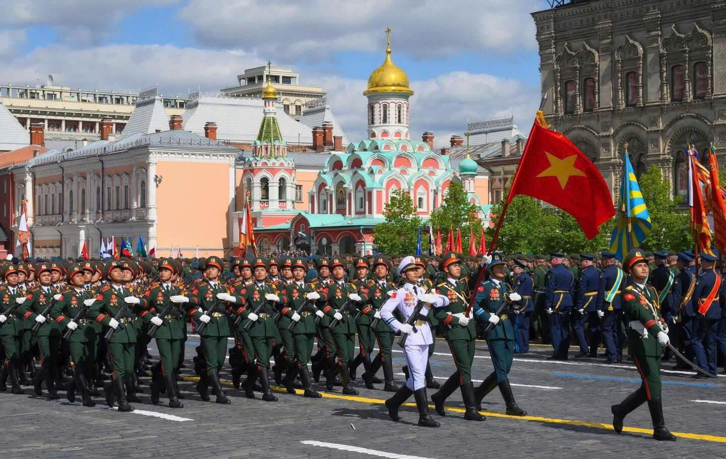 Lễ duyệt binh năm nay, lần đầu tiên Quân đội Nhân dân Việt Nam cử đoàn 86 chiến sĩ và cán bộ tham gia. Trên Quảng trường Đỏ ngày 9/5, lá cờ đỏ sao vàng tung bay cùng với cờ các nước cử đoàn tham dự khác như Belarus, Kazakhstan, Trung Quốc, các nước Cộng đồng các quốc gia độc lập SNG … tạo nên cảm xúc đặc biệt trong cộng đồng người Việt tại Nga nói riêng và mọi người dân Việt Nam nói chung.
