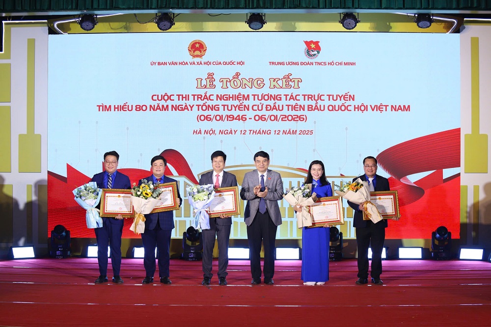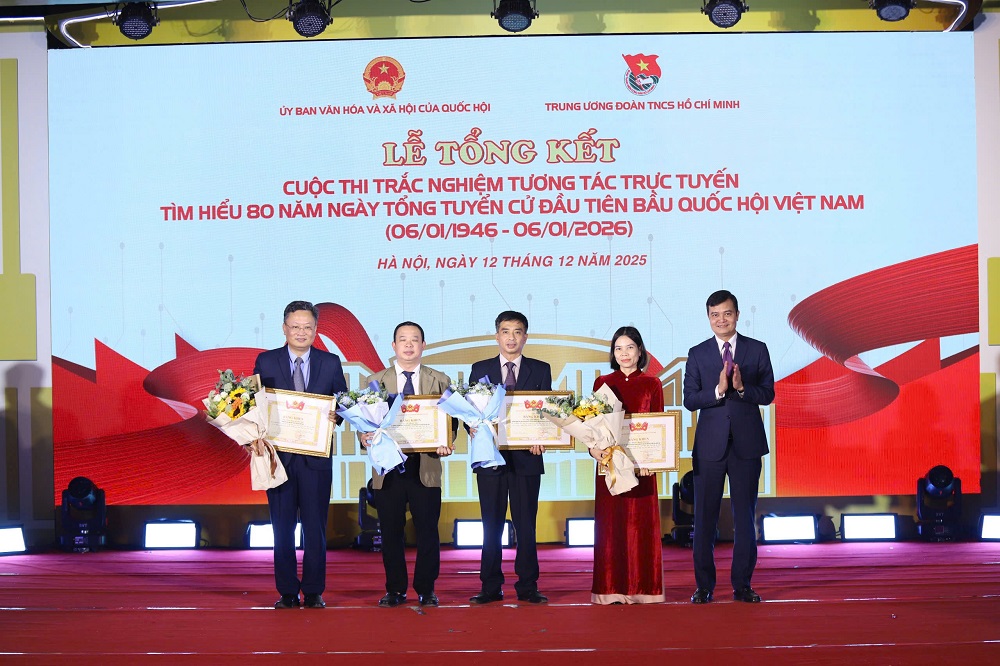 Đồng chí Tạ Văn Hạ, Phó Chủ nhiệm Ủy ban Văn hóa và Xã hội của Quốc hội và đồng chí Nguyễn Phạm Duy Trang, Bí thư Trung ương Đoàn, Chủ tịch Hội đồng Đội Trung ương trao phần thưởng cho các thí sinh xuất sắc đạt giải Nhất tuần chặng 2 của Cuộc thi.
