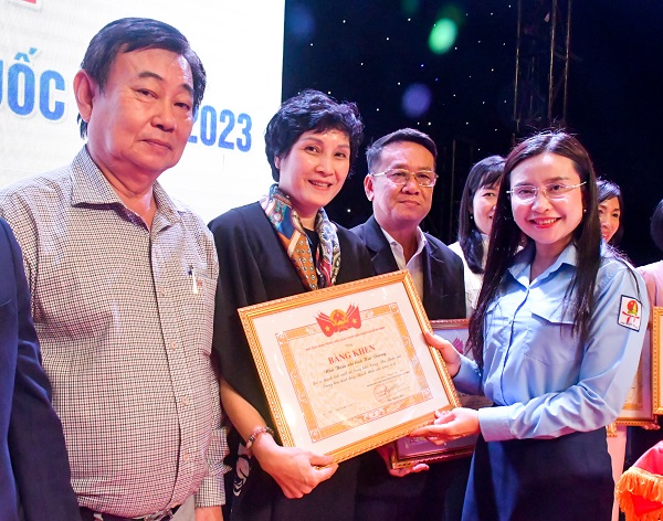 Phó Bí thư Thường trực Tỉnh ủy Cao Thị Hòa An và Chủ tịch Hội đồng Đội Trung ương Nguyễn Phạm Duy Trang trao bằng khen của Trung ương Đoàn cho các đơn vị có thành tích trong hoạt động của hệ thống nhà thiếu nhi năm 2023.