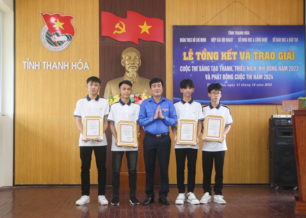 Đồng chí Lê Văn Châu, Bí thư Tỉnh đoàn trao Giấy chứng nhận của Ban Tổ chức cho nhóm tác giả có mô hình đoạt giải Nhất tại “Cuộc thi sáng tạo thanh thiếu niên, nhi đồng Thanh Hoá năm 2023”.