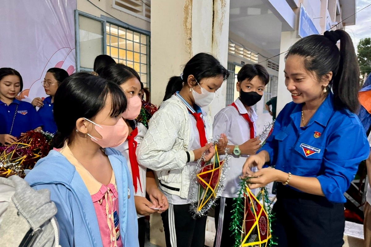Đồng chí Dương Thị Yến Nhi - Ủy viên Ban Thường vụ, Trưởng Ban Thanh thiếu nhi - Trường học Tỉnh đoàn tặng quà và lồng đèn ông sao cho các em thiếu nhi