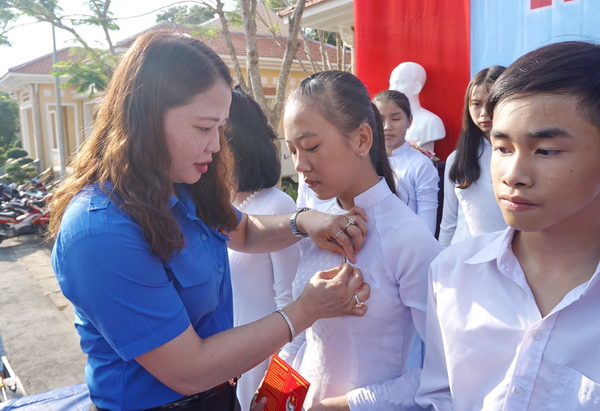 Đ/c Huỳnh Thị Hằng Nga - Bí thư Tỉnh đoàn đeo Huy hiệu Đoàn cho đoàn viên mới kết nạp |