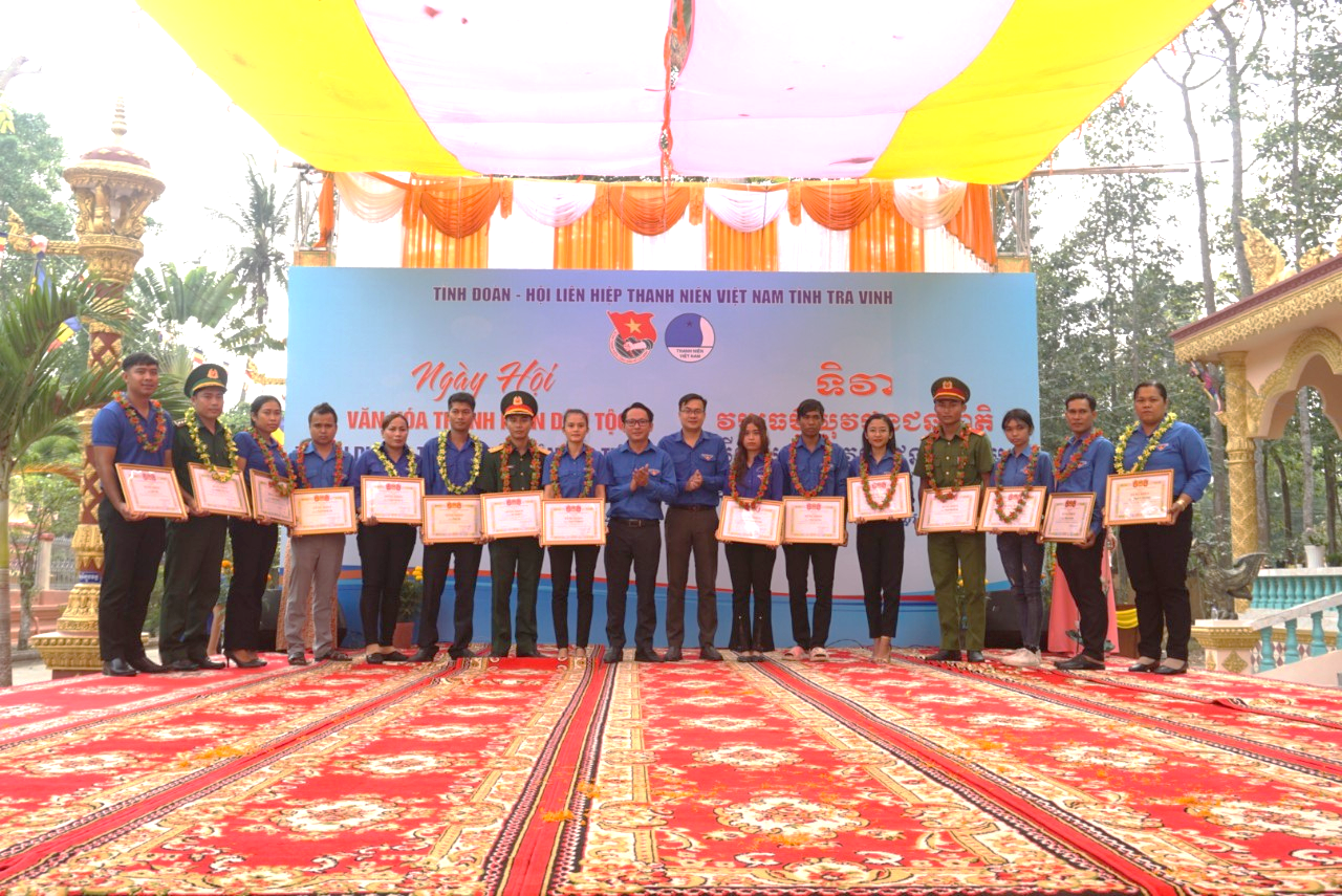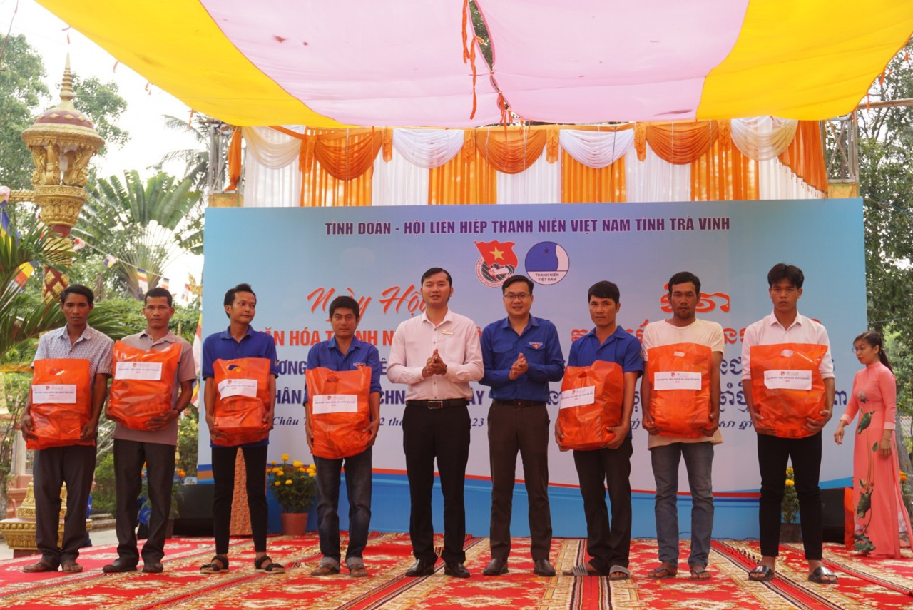 Bên cạnh đó, nhằm thể hiện sự quan tâm của tổ chức Đoàn – Hội trong công tác hỗ trợ, đồng hành cùng thanh niên dân tộc phát triển kinh tế gia đình cũng như vận động các nguồn lực giúp đỡ thanh niên dân tộc có hoàn cảnh khó khăn, yếu thế. Dịp này, Ban Thường vụ Tỉnh đoàn, Ủy ban Hội tỉnh đã phối hợp Ngân hàng chính sách xã hội chi nhánh Trà Vinh hỗ trợ vốn vay lập thân, lập nghiệp cho 04 đoàn viên, thanh niên người dân tộc Khmer trên địa bàn huyện, số tiền vay đối với mỗi cá nhân là 40 triệu đồng; vận động tặng 10 phần quà mỗi phần trị giá 500 nghìn đồng; hỗ trợ kinh phí xây dựng nhà nhân ái cho hộ dân tộc Khmer thuộc diện hộ nghèo với số tiền là 50 triệu đồng.