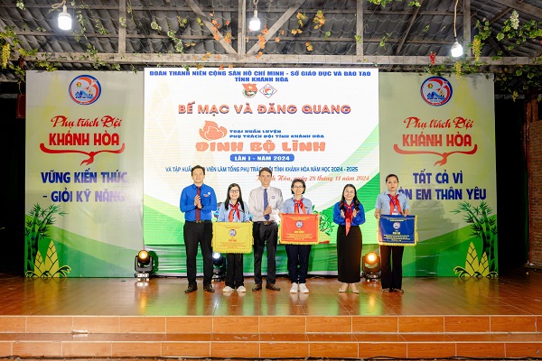 Đồng thời, Hội đồng Đội tỉnh cũng khen thưởng cho 07 anh chị Tổng phụ trách Đội lớn tuổi nhiều năm công tác và tham gia tích cực các hoạt dộng tại Trại huấn luyện. Và tuyên dương, trao cờ cho 03 đơn vị đã tham gia và chuẩn bị rất tốt các điều kiện để trại sinh tham gia và đạt kết quả cao tại Trại Huấn luyện: Giải Nhất – TP. Nha Trang; Giải Nhì - TX. Ninh Hòa; Giải Ba – TP. Cam Ranh.