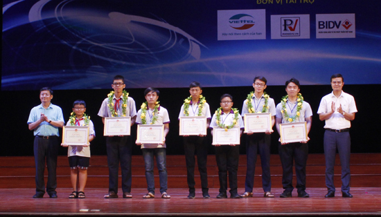 Đồng chí Bùi Quang Huy, Bí thư Trung ương Đoàn, Chủ tịch Hội sinh viên Việt Nam và đồng chí Trần Tiến Dũng, Phó Chủ tịch UBND tỉnh Quảng Bình trao giải Nhất cho các thí sinh