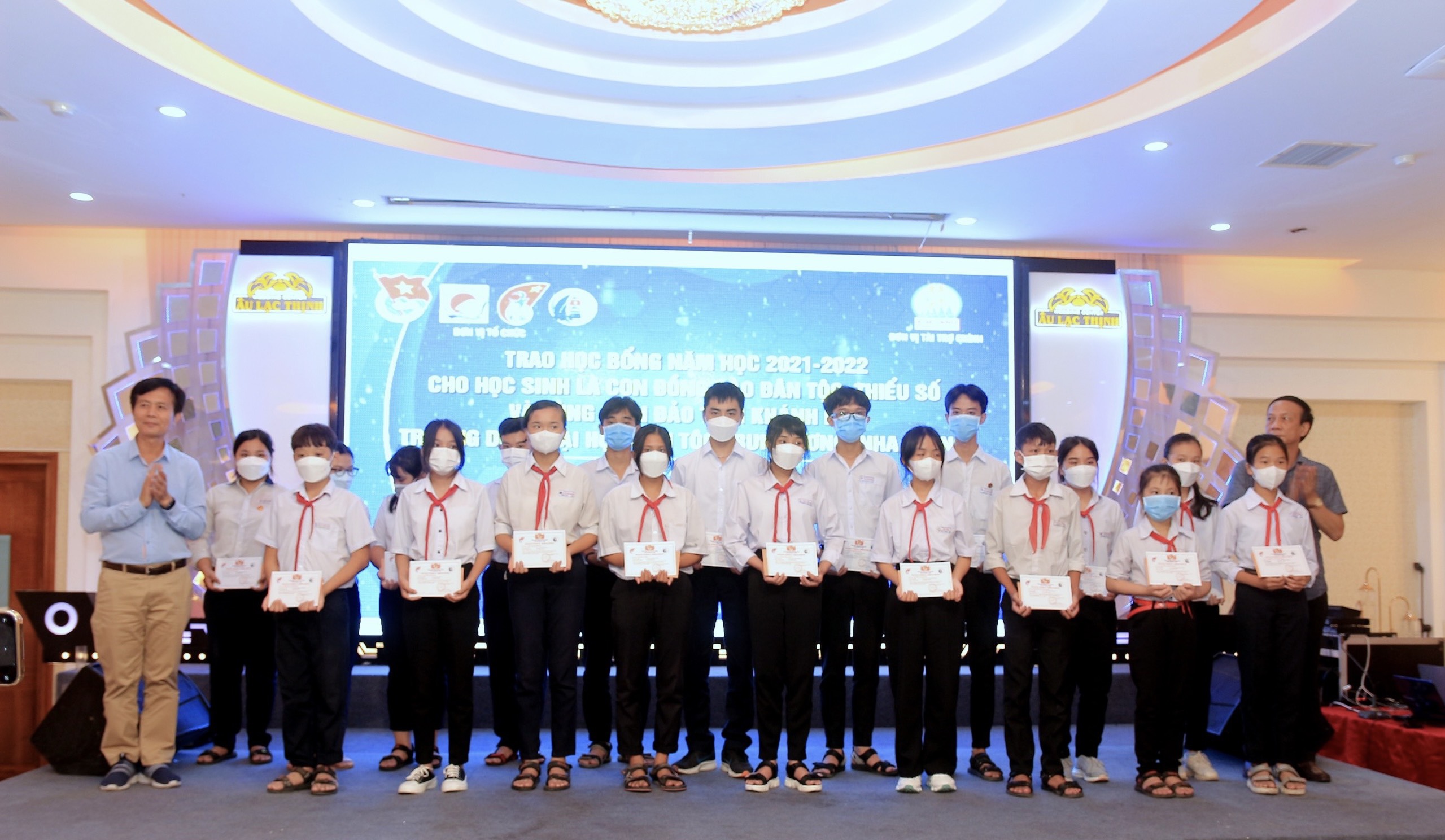 Đại diện Quỹ và Thường trực Tỉnh đoàn trao học bổng Vừ A Dính cho các em học sinh dân tộc thiểu số có hoàn cảnh gia đình khó khăn