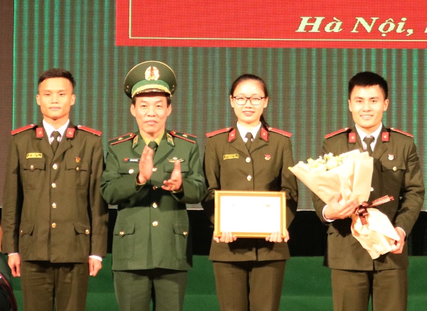 Thiếu tướng Đỗ Danh Vượng - Chính ủy BĐBP trao giải Nhất tập thể cho nhóm tác giả của Câu lạc bộ sinh viên nghiên cứu khoa học, Học viện Chính trị Công an nhân dân