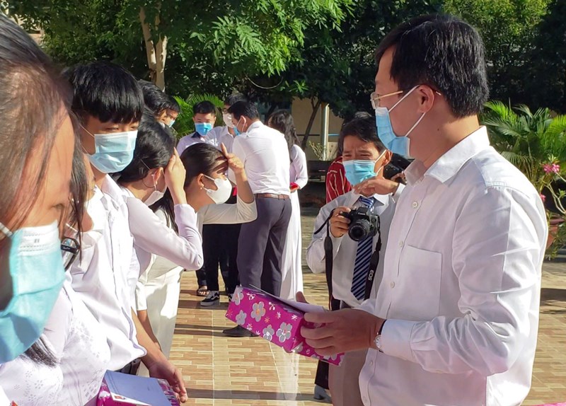 Đồng chí Lê Quốc Phong trao học bổng cho các em học sinh nghèo vươt khó
