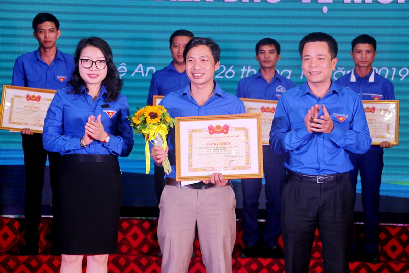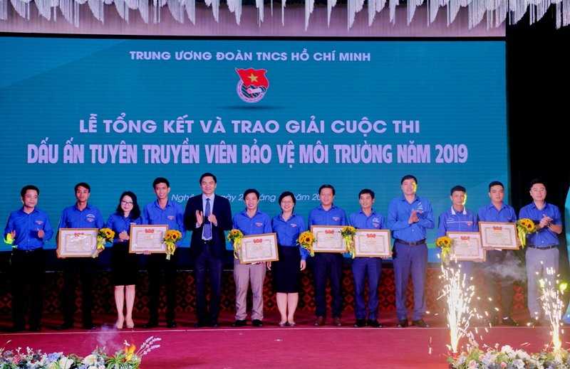 Quyền Bí thư Tỉnh đoàn Nghệ An Nguyễn Thị Thơm trao giải Nhì cho Đội tuyên truyền bảo vệ môi trường xã Lục Dạ, huyện Con Cuông, Nghệ An |